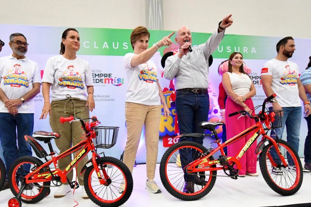 Como parte de la fiesta del cierre de los cursos, el presidente municipal rifó 27 bicicletas entre los menores, quienes se mostraron entusiasmados y disfrutaron de una divertida mañana en el Complejo Cultural y Deportico La Jabonera.