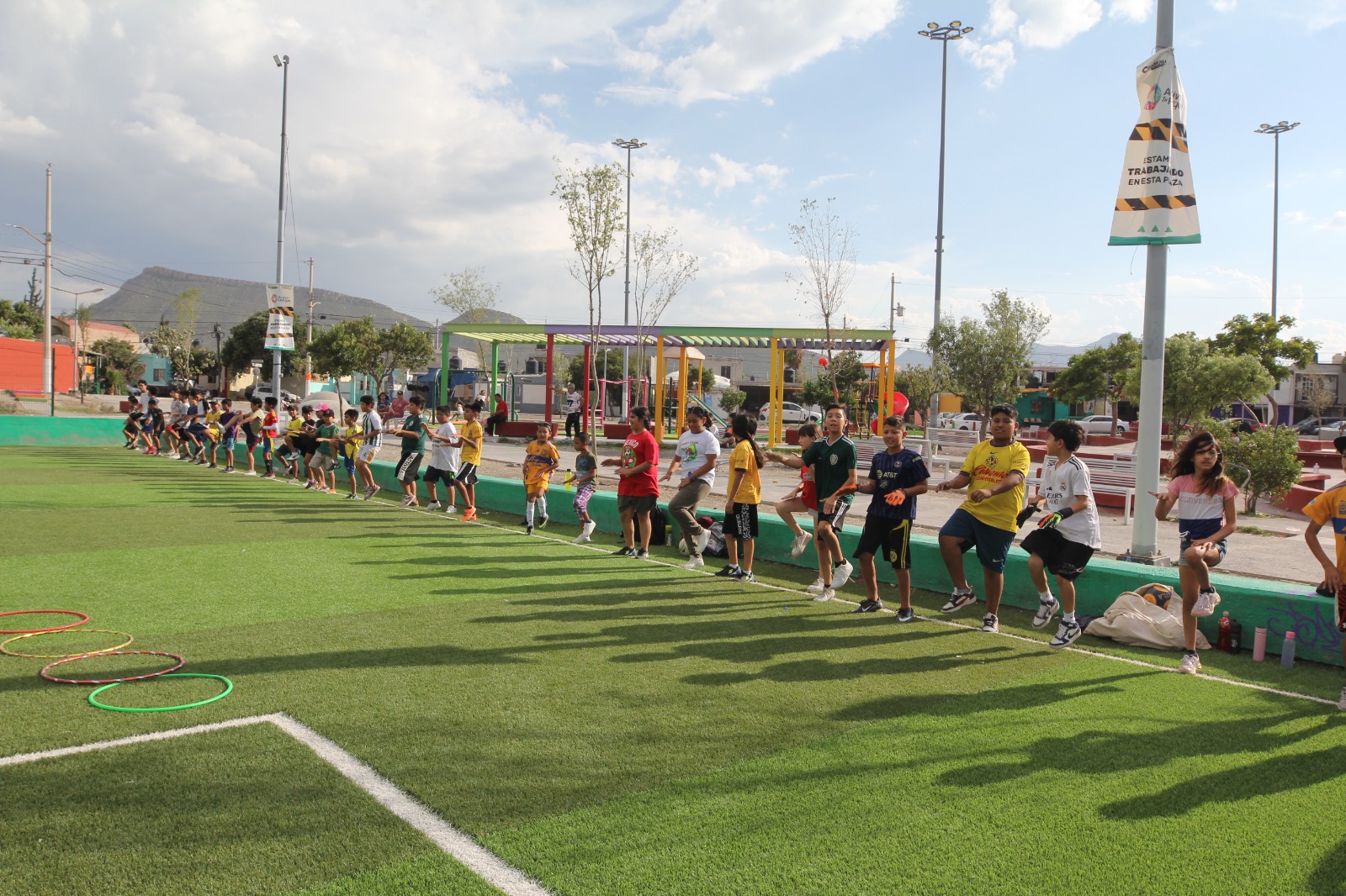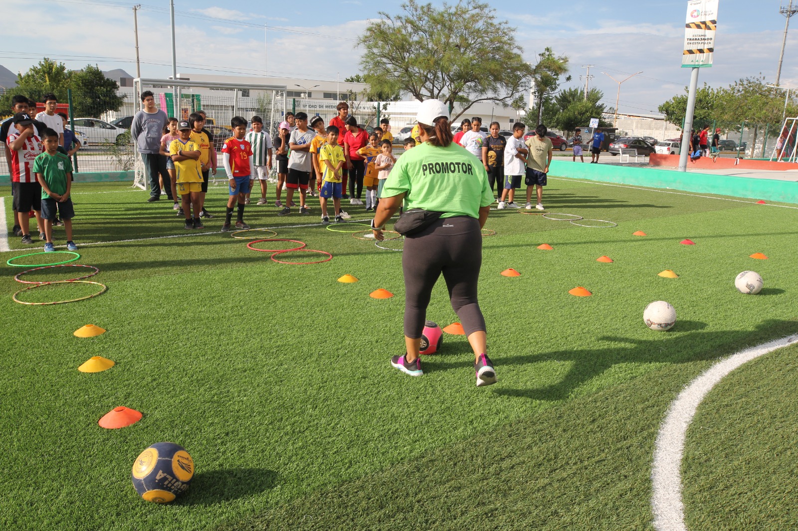 Gracias al impulso del alcalde Javier Díaz González hacia el deporte al interior de las colonias, niñas, niños y jóvenes toman la plaza de la Saltillo 2000 para participar en las clases de fútbol que se imparten a través de los promotores deportivos.