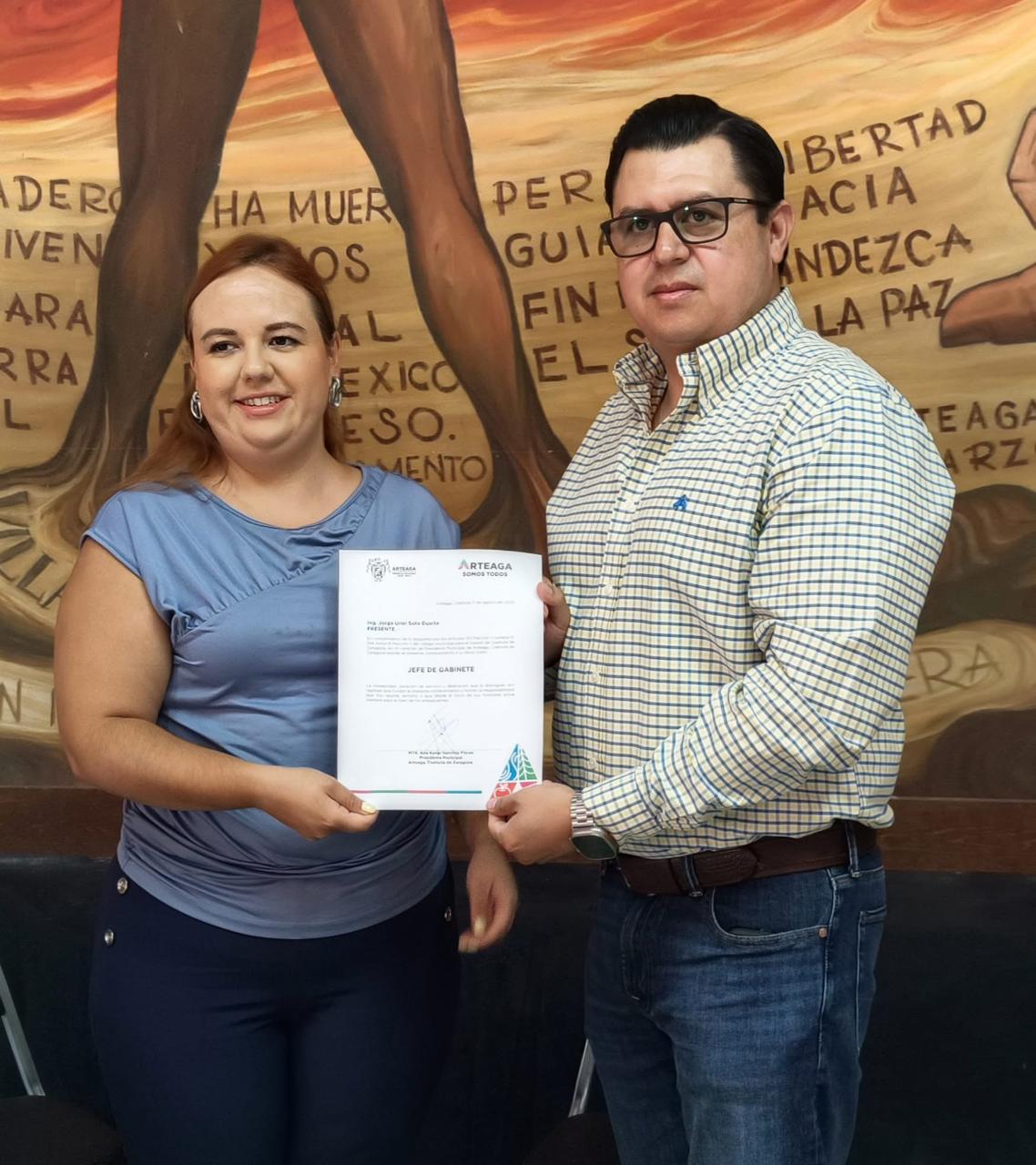 Arteaga.- La alcaldesa de Arteaga, Ana Karen Sánchez Flores, entregó el nombramiento como jefe de gabinete a Jorge Soto Duarte, con lo que refuerza su equipo de trabajo en estos primeros meses de gestión.
