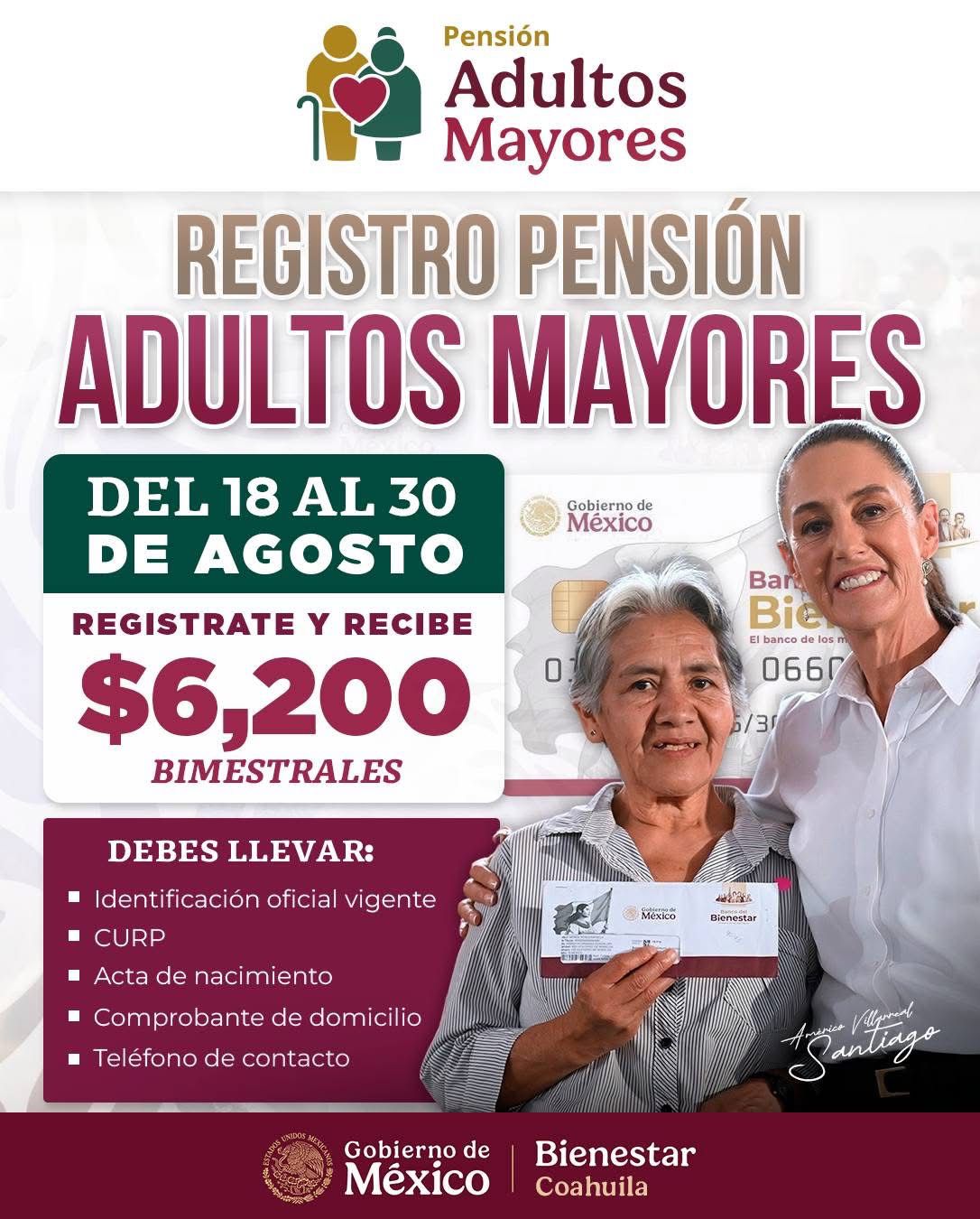 La Secretaría de Bienestar en Coahuila informó que del 18 al 30 de agosto se realiza en todo el estado el registro a la Pensión para el Bienestar de las Personas Adultas Mayores, programa universal dirigido a quienes tienen 65 años o más.