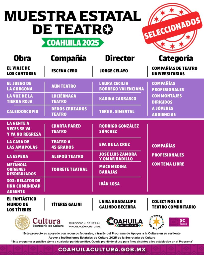 El Gobierno del Estado de Coahuila y la Secretaría de Cultura informan que han sido seleccionadas las compañías que participarán en la Muestra Estatal de Teatro Coahuila. Este encuentro tiene como objetivo promover la creación escénica en nuestro estado y llevar el teatro a diversos municipios, fortaleciendo así la vida cultural de las comunidades.