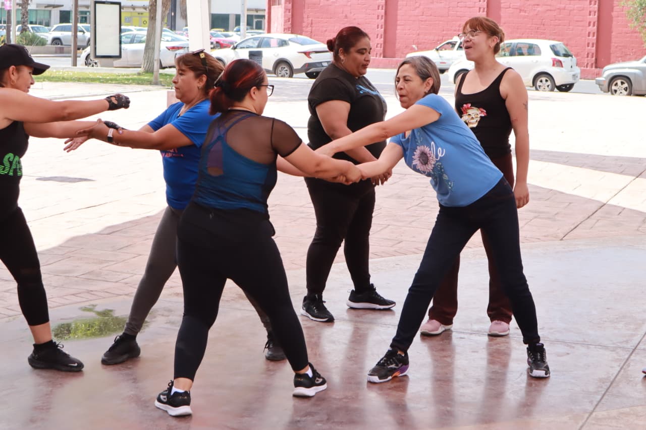 Mujeres saltillenses participaron en el taller de Defensa Personal en la explanada de la Presidencia Municipal, donde aprendieron diferentes técnicas para su seguridad.