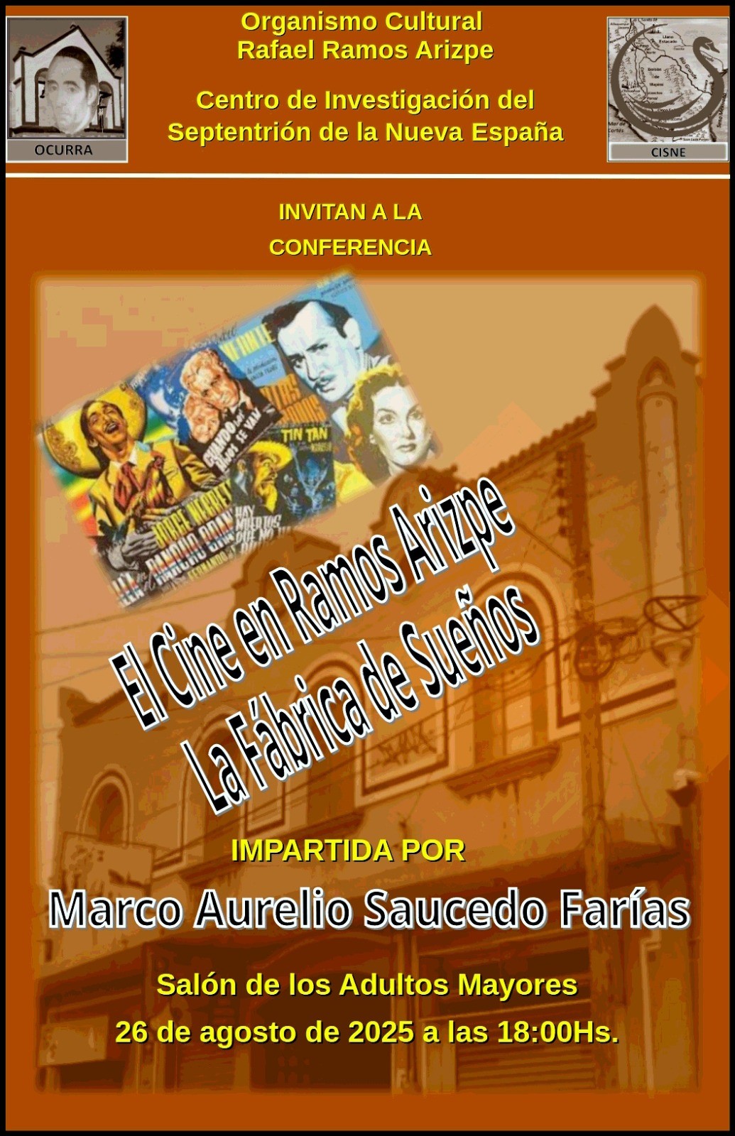 El Organismo Cultural “Rafael Ramos Arizpe” y el Centro de Investigación del Septentrión de la Nueva España anunciaron la realización de la conferencia “El Cine en Ramos Arizpe, la Fábrica de Sueños”, la cual será impartida por Marco Aurelio Saucedo Farías el próximo martes 26 de agosto de 2025 a las 18:00 horas en la Casa del Adulto Mayor, en la Zona Centro de Ramos Arizpe.