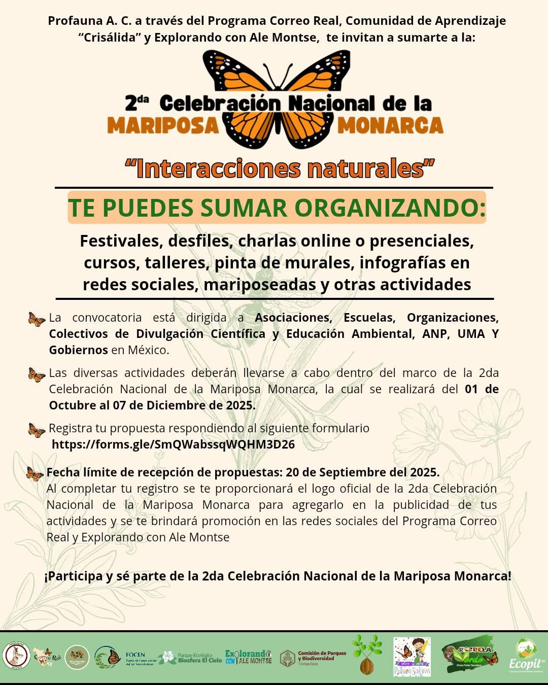 La organización Protección a la Fauna Mexicana AC a través de su programa Correo Real, y la Comunidad de Aprendizaje “Crisálida”, anunciaron que ya está abierta la convocatoria para tomar parte en la Segunda Celebración Nacional de la Mariposa Monarca, misma que está dirigida a escuelas, organizaciones de la sociedad civil, colectivos de divulgación científica y de educación ambiental e instituciones de gobierno.