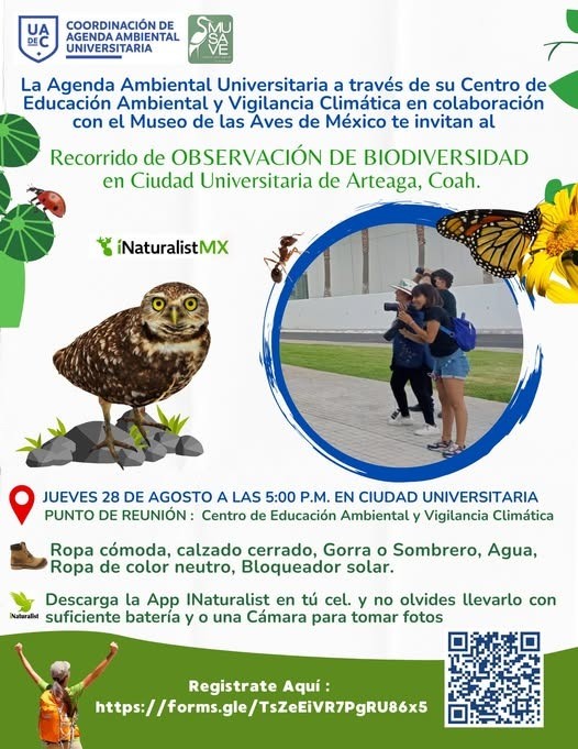 La Universidad Autónoma de Coahuila a través de la Coordinación de Agenda Ambiental Universitaria y el Centro de Educación Ambiental y Vigilancia Climática, en colaboración con el Museo de las Aves de México, invitan al Recorrido de Observación de Biodiversidad en Ciudad Universitaria Campus Arteaga.