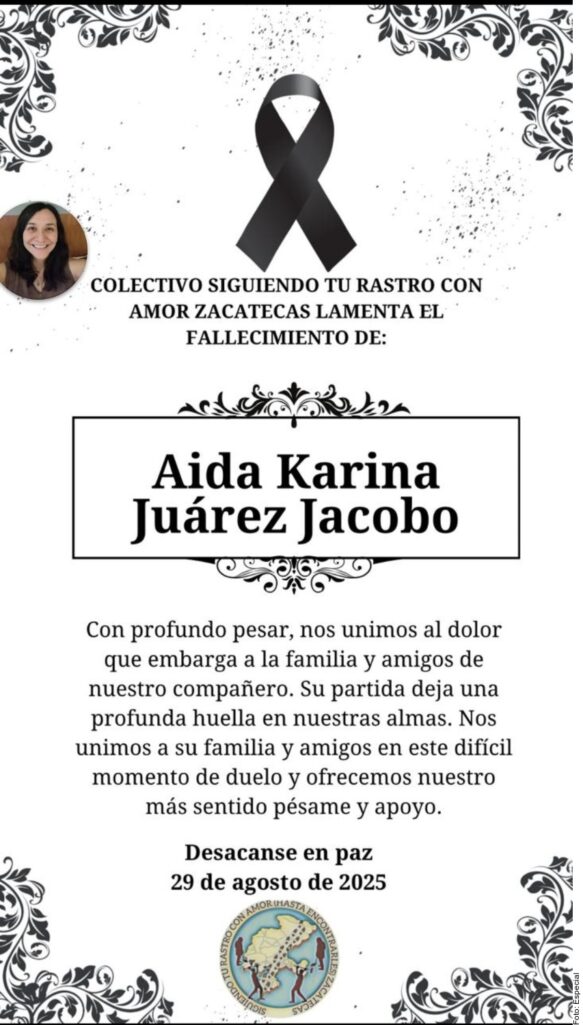 “Exigimos justicia para Aida Karina y para todos los crímenes que afectan a nuestros seres queridos desaparecidos y a los familiares comprometidos en cuerpo y alma con su búsqueda”, manifestó el Colectivo Siguiendo tu Rastro con Amor Zacatecas, quien calificó a la buscadora como madre incansable, activa y amorosa.