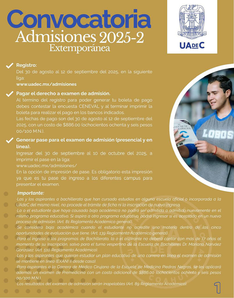 La Universidad Autónoma de Coahuila extiende el periodo de registro de admisiones a Bachillerato y Licenciatura hasta el 12 de septiembre de 2025, para quienes deseen ingresar a la máxima casa de estudios al semestre enero-junio 2026.