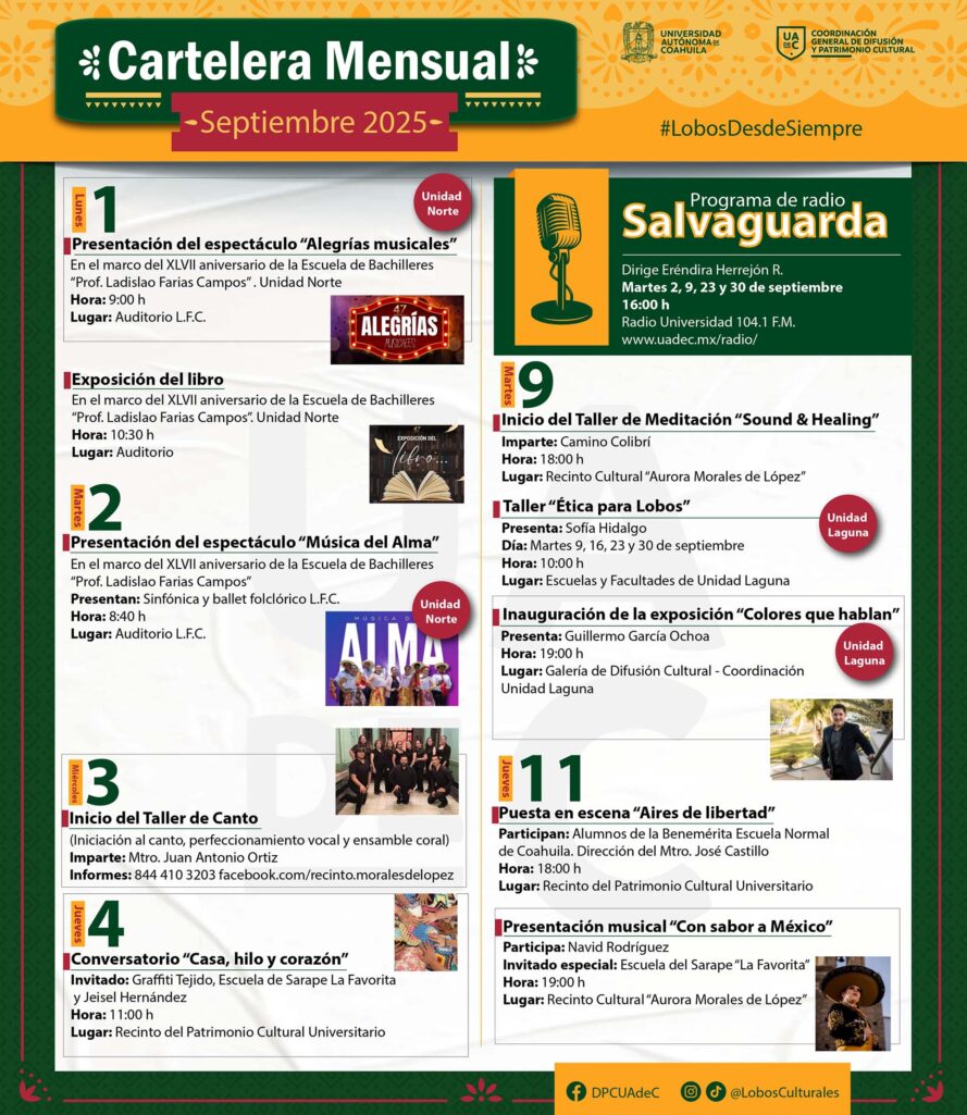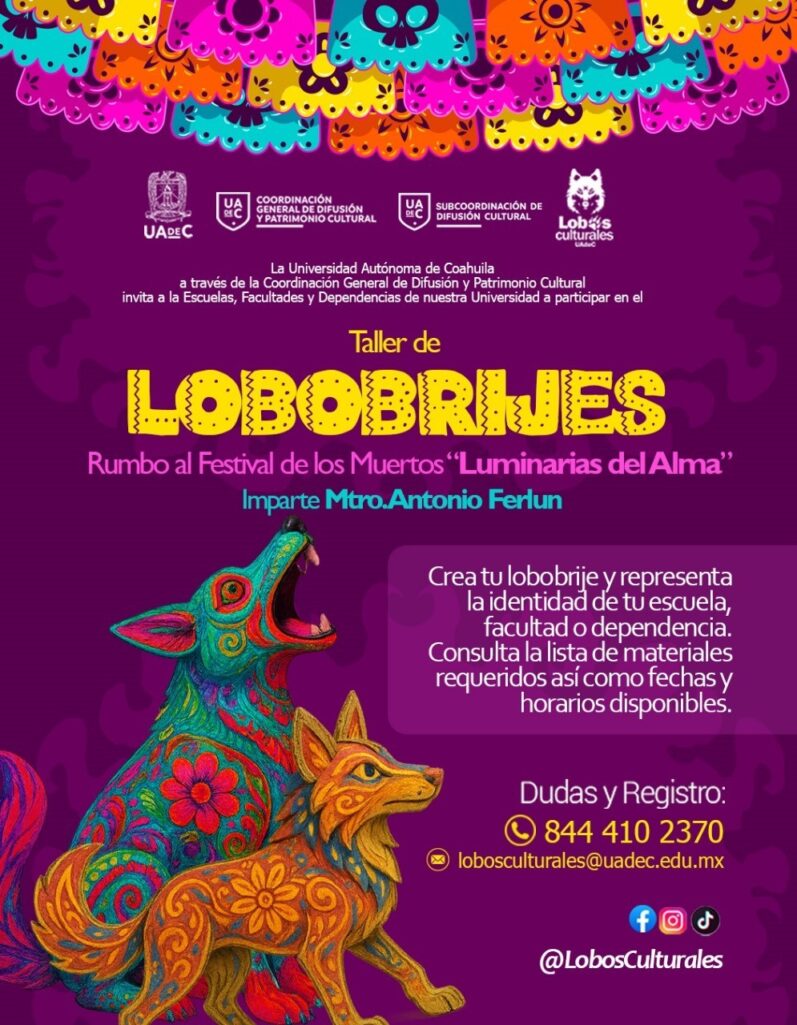En la Unidad Sureste, el 2, 9, 23 y 30 de septiembre a las 16:00 horas por Radio Universidad 104.1 F.M. o por internet www.uadec.mx/radio podrán escuchar el programa de radio “Salvaguarda” y durante todo el mes se estará llevando a cabo el “Taller de Lobobrijes”, rumbo al Festival de los Muertos “Luminarias del Alma” 2025, será impartido por el Mtro. Antonio Ferlun, registrarse en el (844) 410- 2370 y en el correo lobosculturales@uadec.edu.mx.