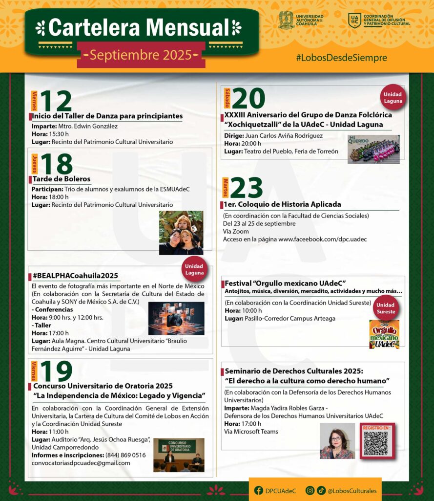 El 20 de septiembre a las 20:00 horas en el Teatro del Pueblo de la Feria de Torreón se llevará a cabo el XXXIII Aniversario del Grupo de Danza Folclórica Xochiquetzalli de la UA de C; el 18 de septiembre de 9:00 a 11:00 horas y a las 17:00 horas en el Aula Magna del Centro Cultural Braulio Fernández Aguirre el ciclo de conferencias #BEALPHACoahuila2025.