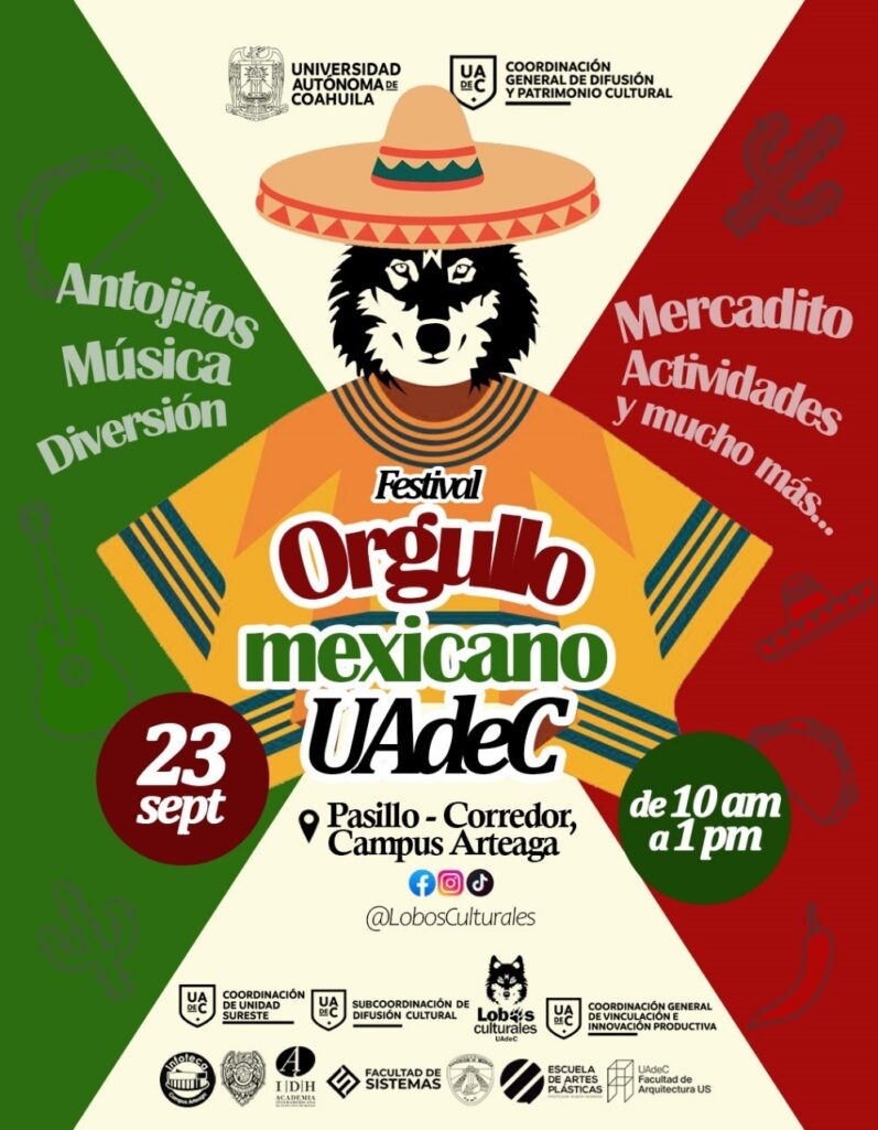 El 23 de septiembre a las 10:00 horas en el pasillo-corredor de Campus Arteaga, se desarrollará el festival “Orgullo mexicano UA de C”, en el que habrá antojitos, música, diversión, mercadito, actividades y mucho más; el día 25 a las 9:00 horas en la Facultad de Artes Plásticas Campus Arteaga, se llevará a cabo el evento de fotografía más importante del norte de México en colaboración con la Secretaría de Cultura del Estado de Coahuila y SONY México y ese mismo día a las 17:00 horas se realizará el taller de capacitación #BEALPHACoahuila2025.