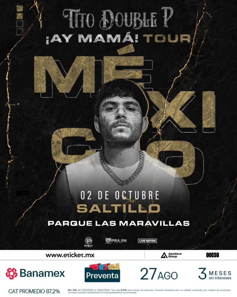 A través de redes sociales, la empresa de entretenimiento Apodaca Group anunció que el cantante de música regional mexicana, Tito Double P llegará a Saltillo por primera vez como parte de su tour “Ay Mamá” y a continuación te contamos todos los detalles.