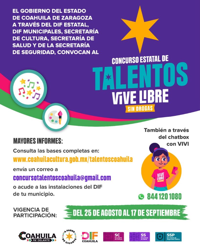El Gobierno del Estado de Coahuila de Zaragoza, a través del DIF Coahuila y la Secretaría de Cultura, en el marco del programa “Vive Libre Sin Drogas”, invita a las y los coahuilenses de los 38 municipios a participar en el Concurso Estatal de Talentos “Vive Libre sin Drogas”.