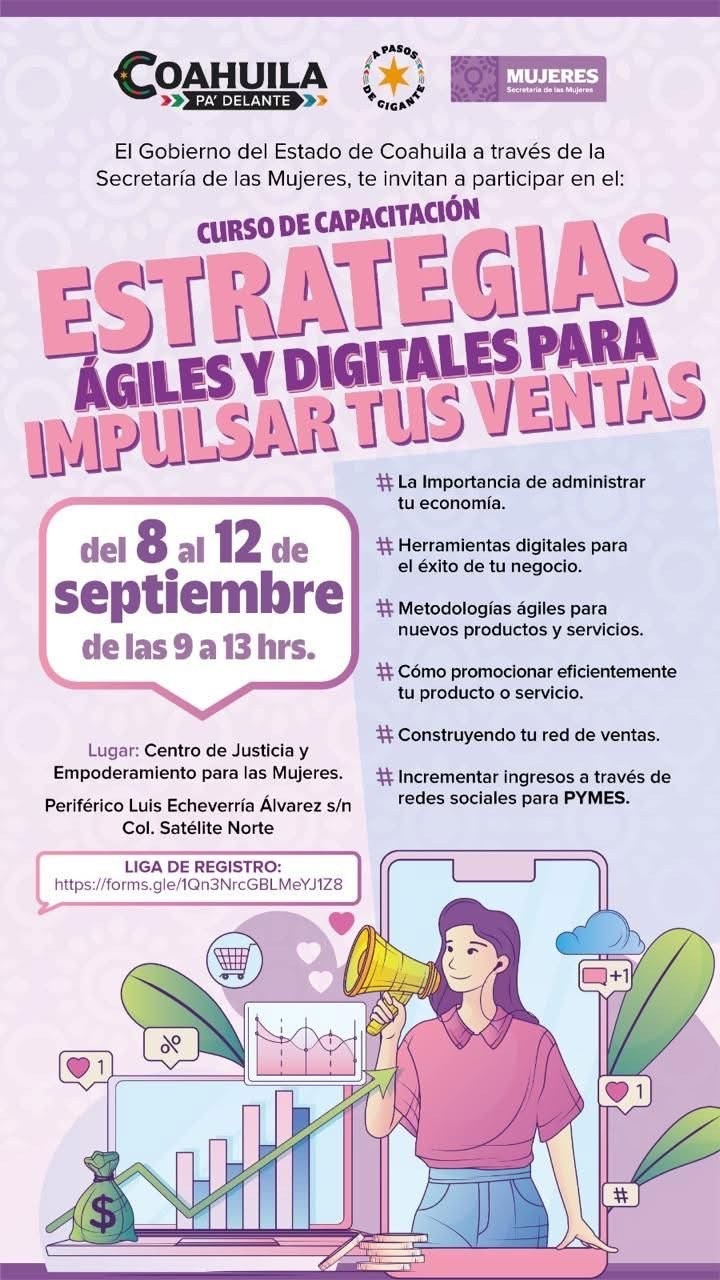 La Cámara Nacional de Comercio (Canaco) en Ramos Arizpe, a través de su delegado Mario Aguirre Rangel, hizo un llamado a comerciantes, emprendedores y pequeñas empresas de la ciudad a participar en el curso de capacitación “Estrategias Ágiles y Digitales para Impulsar Tus Ventas”, que organiza el Gobierno del Estado de Coahuila a través de la Secretaría de las Mujeres.