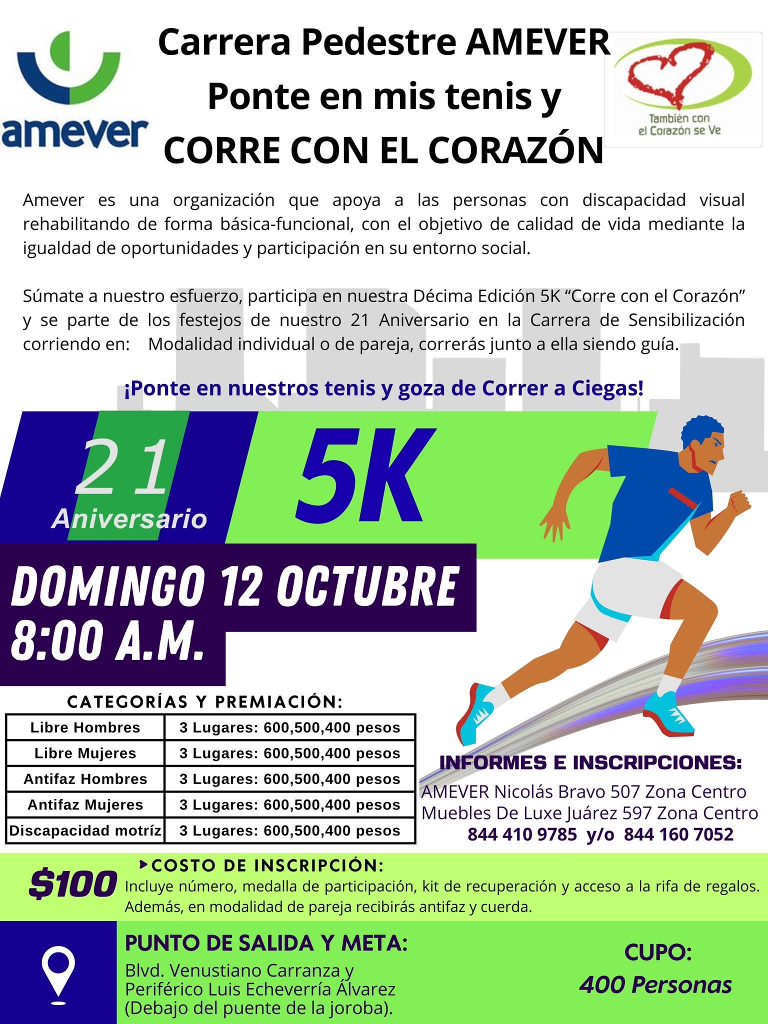 El vicepresidente de la Asociación Mexicana de Enfermedades Visuales y Estudios de la Retina AC (AMEVER), René Perales Torres, informó que ya están abiertas las inscripciones para la carrera 5K “Ponte en mis tenis y corre con el corazón”, misma que se llevará a cabo el próximo 12 de octubre a las 8:00 de la mañana dentro de la Ruta Recreativa, en el marco de la celebración del 21 aniversario de esa organización.