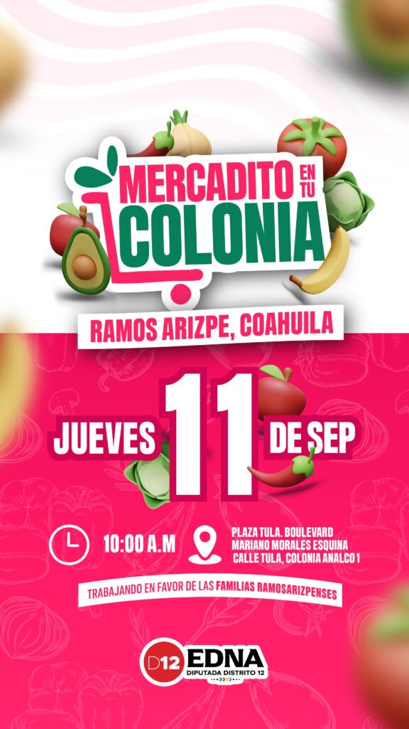 Cada jueves, iniciando este próximo jueves 11 de septiembre en la Plaza Tula, las familias de Ramos Arizpe podrán disfrutar de este gran programa. El “Mercadito en tu Colonia” ofrecerá una variedad de productos frescos y de calidad a precios accesibles y estará recorriendo las colonias del municipio.