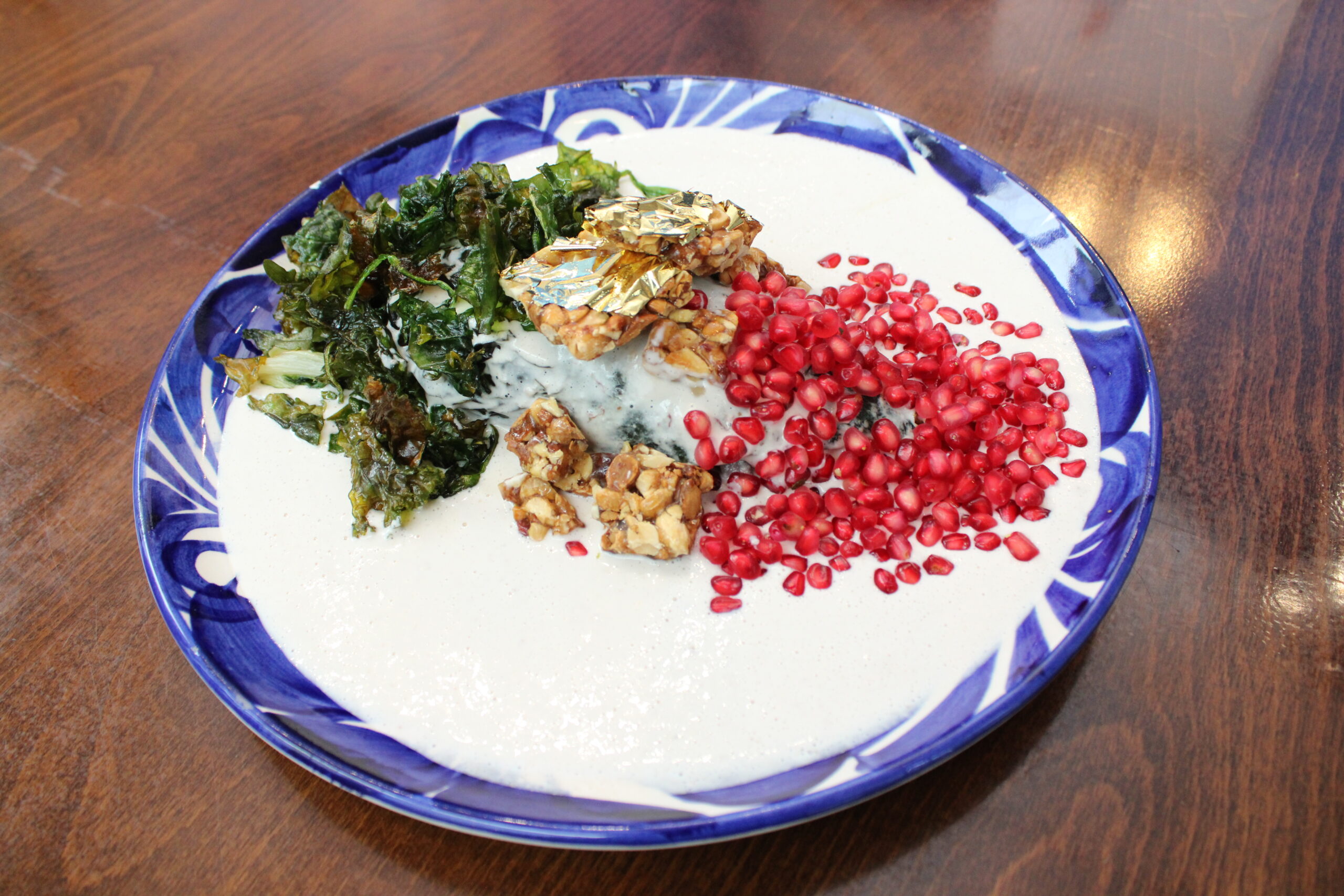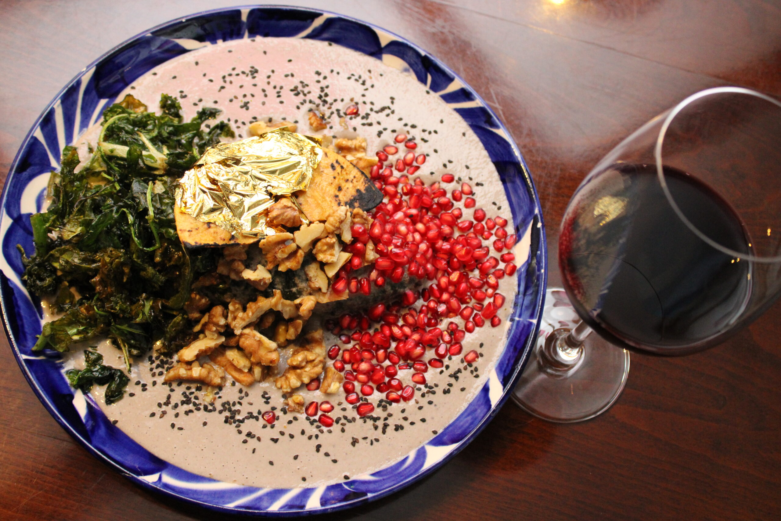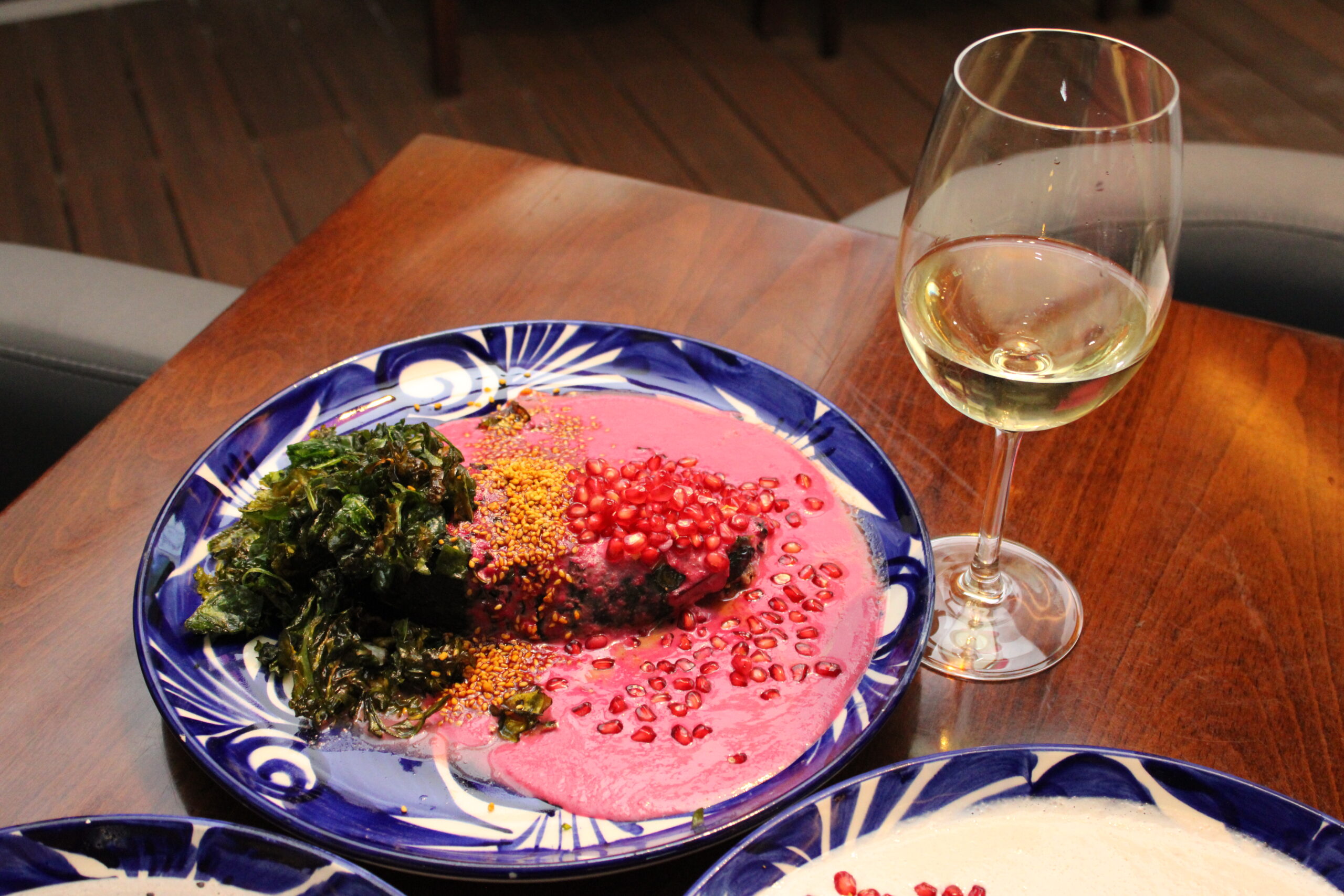 El favorito de la chef, Eclipse va relleno de cabrito ahumado con cenizas de tortilla nixtamalizada, frutas de temporada y nueces tatemadas, evocando sabores de rancho. La nogada se enriquece con un sofrito de huitlacoche, “el oro mexicano”, como ella lo llama. Se corona con un crocante de tortilla a las brasas, frito y luego vestida en oro comestible.