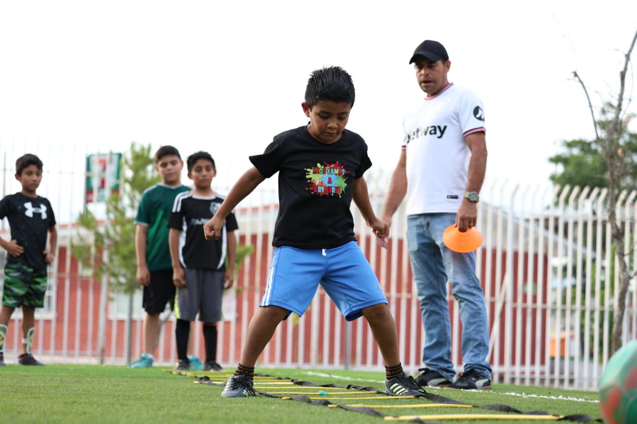 Niñas y niños de la colonia Benito Juárez tuvieron la oportunidad de convivir y jugar con integrantes del equipo de Saltillo Soccer en la recién rehabilitada cancha de fútbol como parte del programa “Activa tu Parque” que impulsa el alcalde Javier Díaz González.