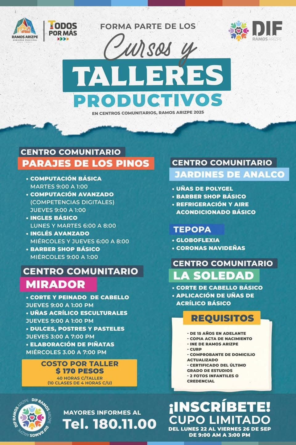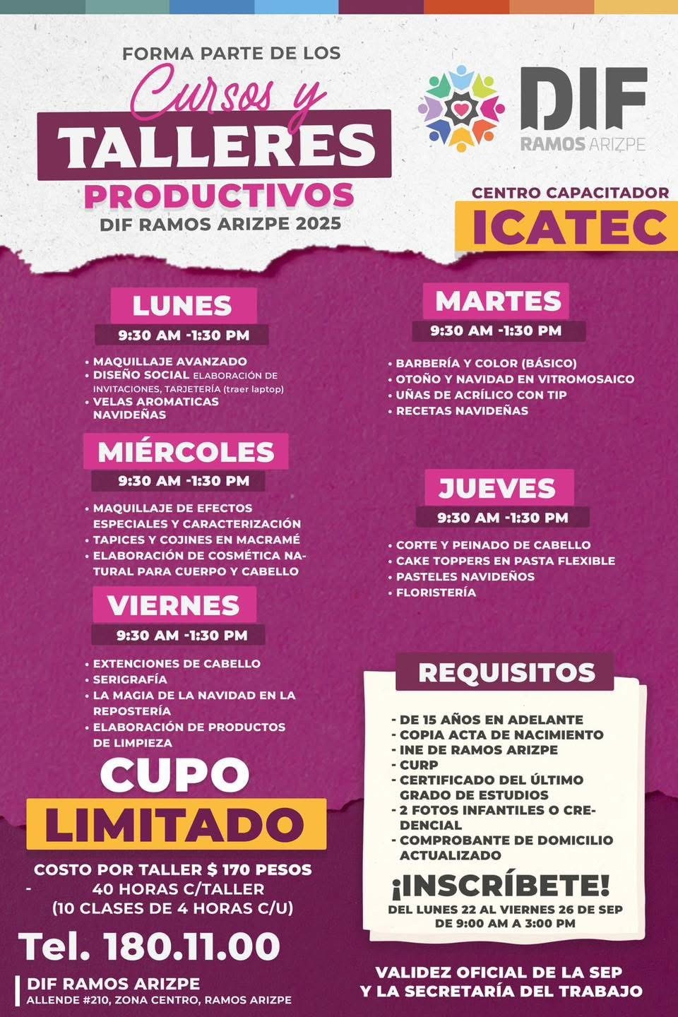 Cada taller tiene un costo simbólico de 170 pesos por 40 horas de capacitación (10 clases de cuatro horas), con validez oficial de la SEP y la Secretaría del Trabajo. El cupo es limitado y el registro estará abierto del lunes 22 al viernes 26 de septiembre, en horario de 9:00 a 15:00 horas.
