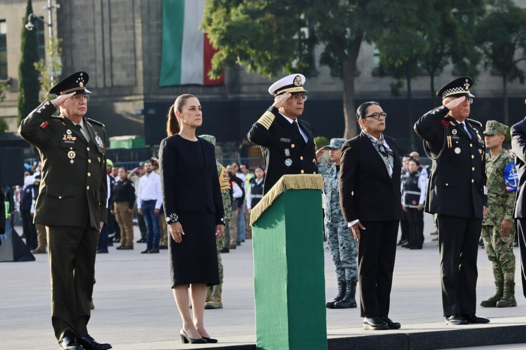 Ciudad de México.- La presidenta Claudia Sheinbaum encabezó este viernes el izamiento de bandera en el Zócalo capitalino por los sismos de 1985 y 2017.