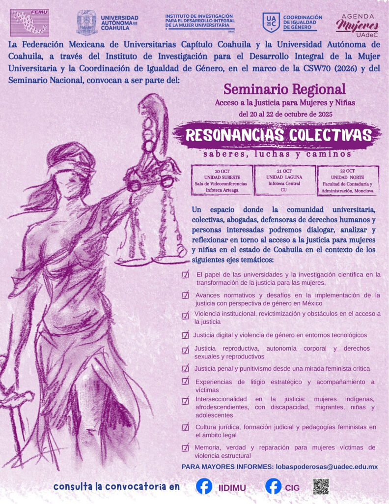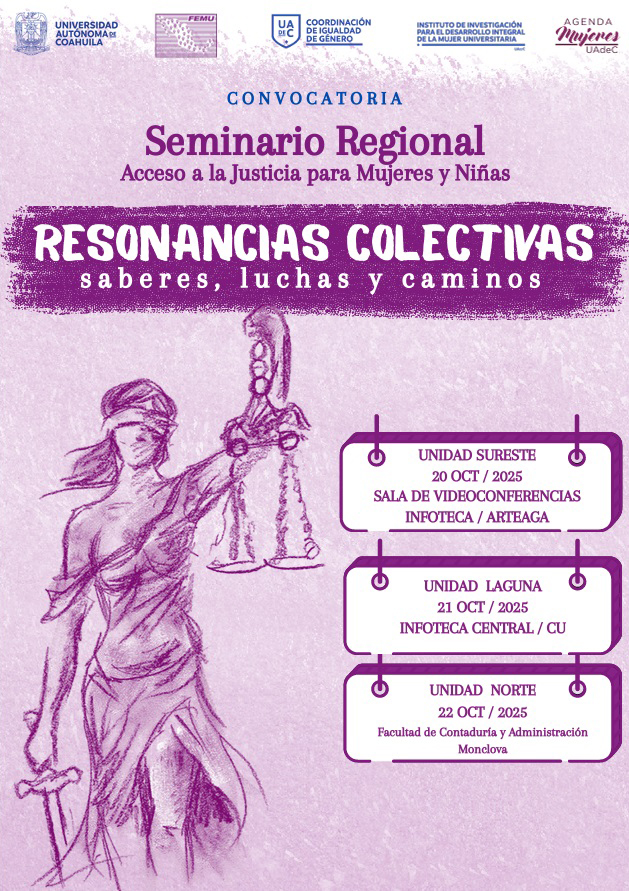La Universidad Autónoma de Coahuila, a través del Instituto de Investigación para el Desarrollo Integral de la Mujer Universitaria (IIDIMU) y la Coordinación de Igualdad de Género, en conjunto con la Federación Mexicana de Universitarias Capítulo Coahuila, invitan a la comunidad universitaria al Seminario Regional Acceso a la Justicia para Mujeres y Niñas: Resonancias Colectivas, saberes, luchas y caminos.