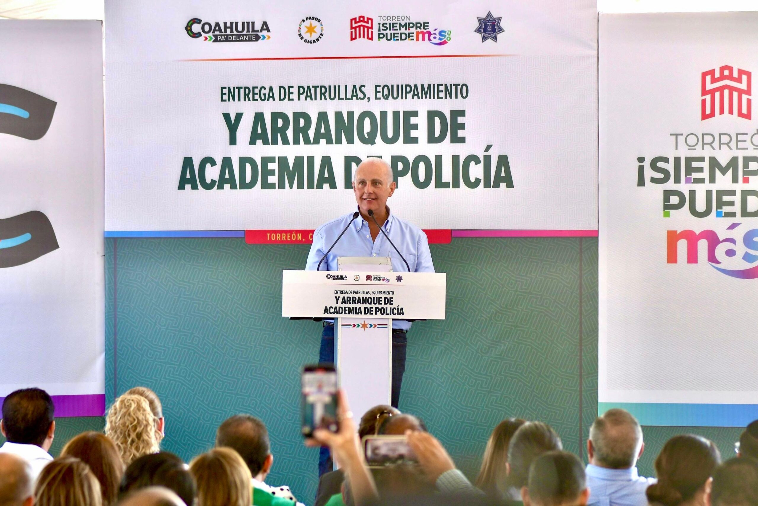 Entregan Manolo y Román patrullas, equipamiento y uniformes; también inicia la Academia de Policía de Torreón