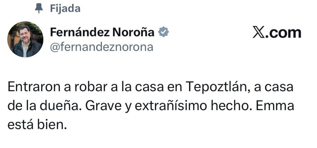 El legislador, a través de su cuenta de ‘X’, detalló que el robo se dio en la vivienda donde habita la mujer que le vendió la casa. En su mensaje señaló: “Entraron a robar a la casa en Tepoztlán, a casa de la dueña. Grave y extrañísimo hecho. Emma está bien”, escribió.