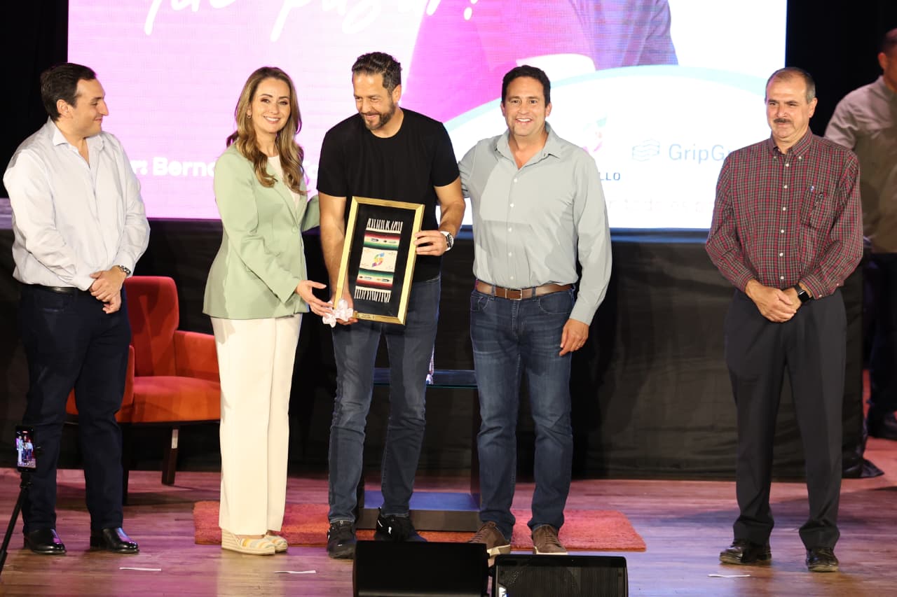 Javier Díaz González y su esposa Luly López Naranjo, presidenta honoraria del DIF Saltillo, entregaron un reconocimiento al conferencista Bernardo FeTa, así como a Jesús García Martínez, director general de Grip Group.