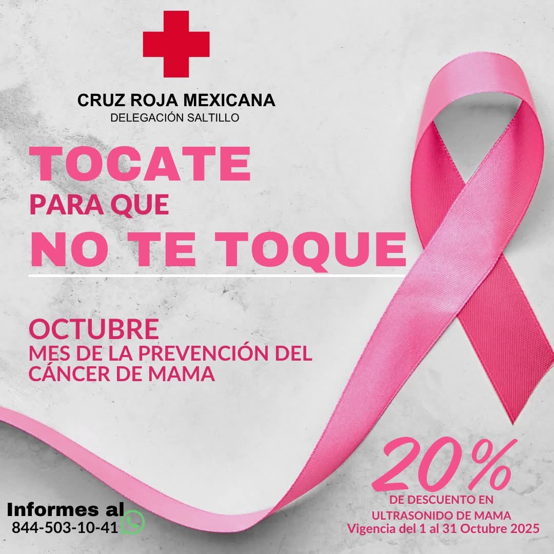 La gerente de la delegación Saltillo de la Cruz Roja, Dinora López, dio a conocer que, en el marco de la celebración en octubre del Mes de la Prevención del Cáncer de Mama, se ofrecerá un 20 por ciento de descuento en los servicios de ultrasonido de mama a las mujeres que acudan a esa institución para solicitar dichos estudios.