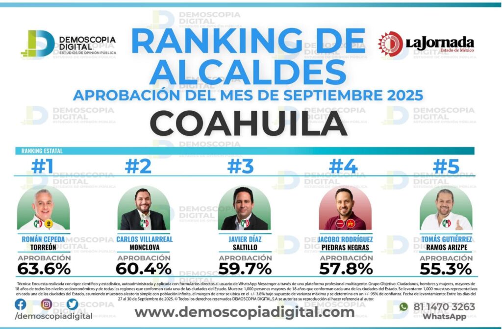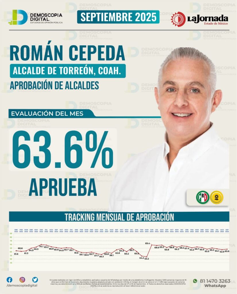 Con una aprobación del 63.6 por ciento, el alcalde reelecto de Torreón, Román Cepeda González, se posicionó como el mejor evaluado durante el pasado mes de septiembre, de acuerdo con la casa encuestadora Demoscopia Digital y el diario La Jornada.