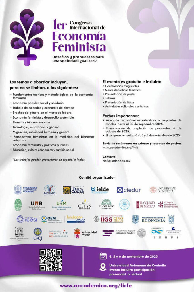 La Universidad Autónoma de Coahuila a través de la Dirección de Investigación y Posgrado, la Coordinación de Igualdad de Género, la Facultad de Economía y el Centro de Investigaciones Socioeconómicas, llevará a cabo del 4 al 6 de noviembre de 2025 el Primer Congreso Internacional de Economía Feminista: Desafíos y propuestas para una sociedad igualitaria.