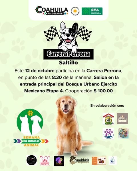 El Gobierno del Estado de Coahuila de Zaragoza, a través de la Secretaría de Medio Ambiente, invita a todas las familias coahuilenses a participar en la Feria de los Animales, que se llevará a cabo el domingo 12 de octubre de 2025 en el Bosque Urbano Ejército Mexicano, Etapa 4 (Aviones), en Saltillo, a partir de las 10:00 de la mañana; así como en las Carreras Perronas que se efectuarán de manera simultánea en 8 municipios.
