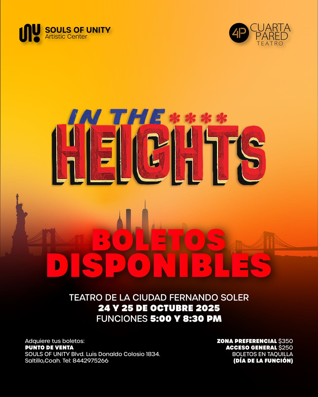 «In The Heights llega a Saltillo, es una celebración del orgullo latino; este próximo 24 y 25 de octubre, Saltillo será sede de una de las producciones teatrales más esperadas del año, es el musical In The Heights», compartió con El Heraldo de Saltillo, María Teresa de León Blanco, quien junto a Michelle González Domínguez es directora coreográfica de este proyecto escénico.