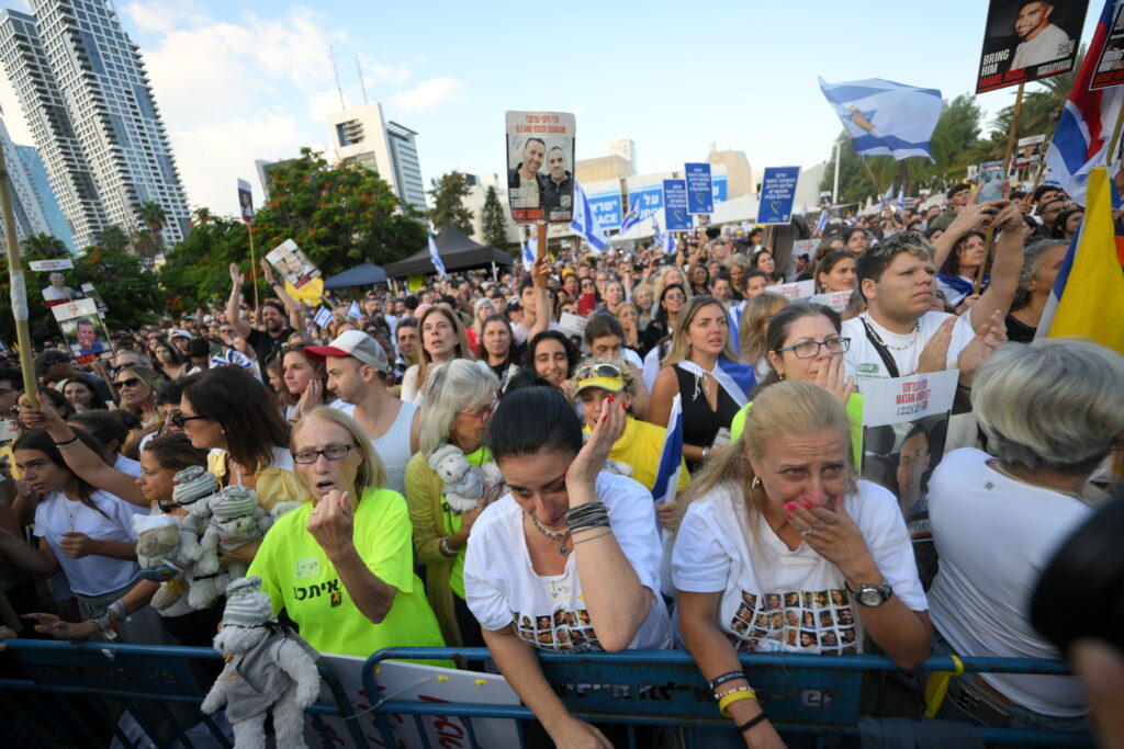 Algunos sostenían banderas israelíes con el lazo amarillo de los rehenes, otros llevaban carteles con los rostros de los cautivos; algunos se llevaban la mano al pecho y contenían las lágrimas.