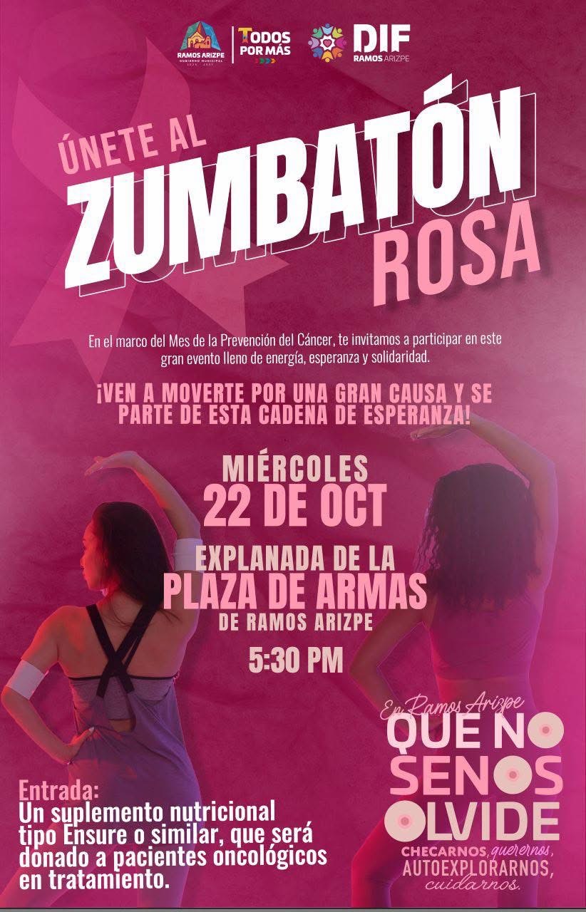 En el marco del mes de la lucha contra el cáncer de mama, el DIF Ramos Arizpe invita a la ciudadanía, principalmente a las mujeres, a participar en el “Zumbatón Rosa”, un evento lleno de energía, esperanza y solidaridad que busca promover la prevención y la autoexploración.
