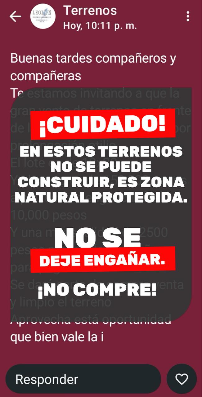 Se informó que circula a través de redes sociales y vía WhatsApp la venta de lotes de 10×20 con un costo de 150 mil pesos con enganche de 10 mil pesos y mensualidades de 2 mil 500 pesos.