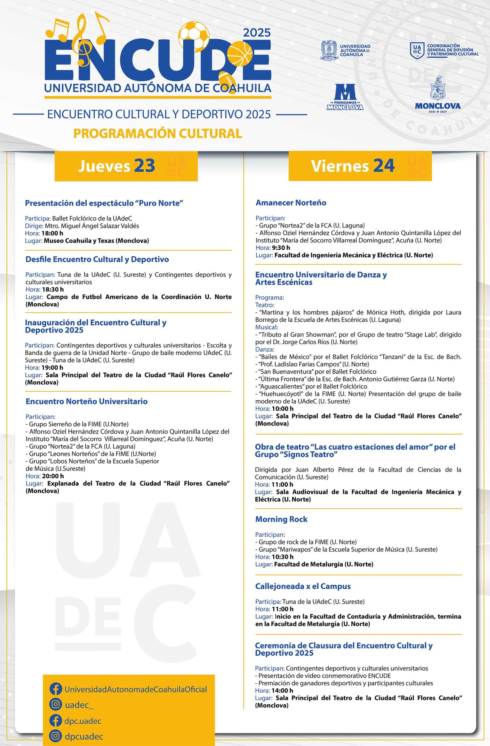 La Universidad Autónoma de Coahuila a través de la Coordinación General de Difusión y Patrimonio Cultural, la Coordinación General del Deporte y el Gobierno Municipal de Monclova administración 2025-2027, presentan la máxima fiesta universitaria cultural y deportiva, ENCUDE 2025, una convivencia que promueve la unión, el intercambio cultural y los retos deportivos de las ligas universitarias y en esta ocasión será en la ciudad de Monclova, Coahuila.