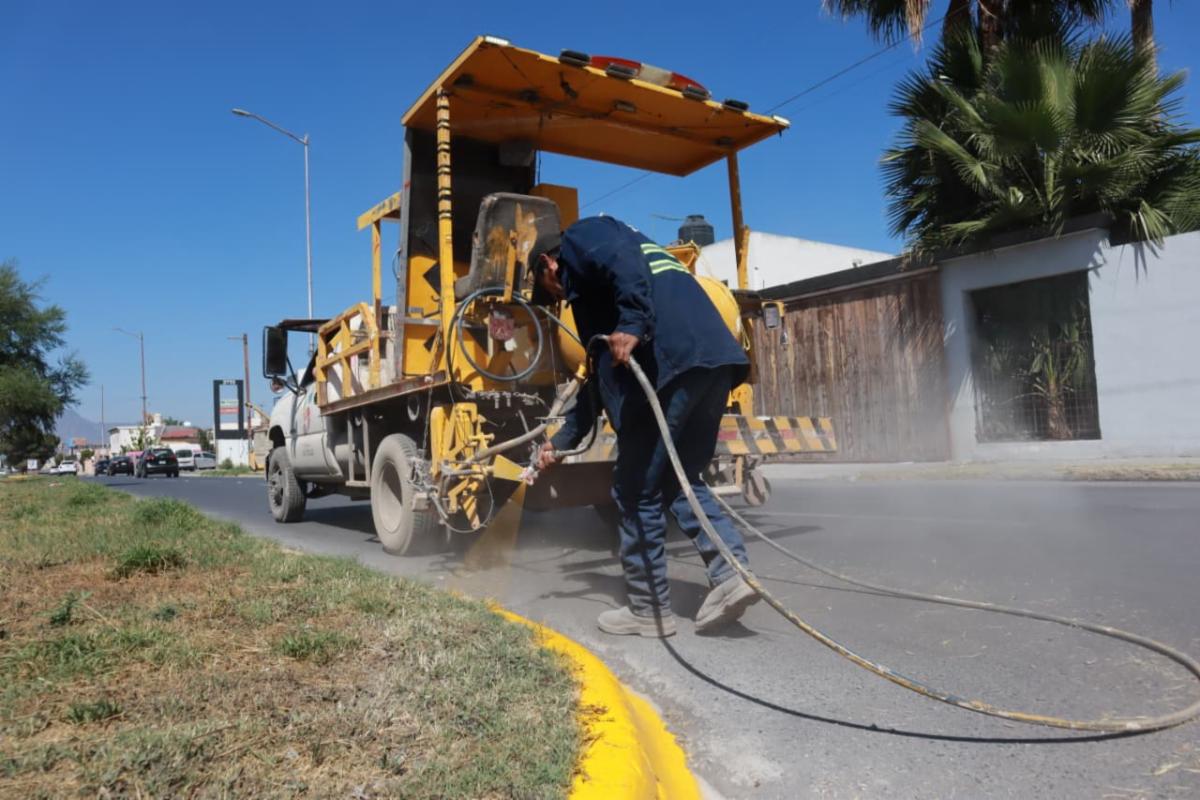 Con el objetivo de mejorar la seguridad y el orden vial en la ciudad, el gobierno de Javier Díaz González realiza trabajos de pintura amarilla en los camellones centrales de diversos bulevares de Saltillo.