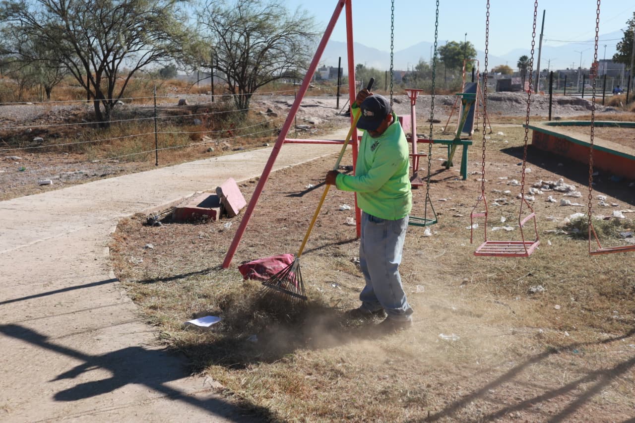 De manera simultánea, cuadrillas de “Aquí Andamos” realizaron labores similares en la plaza pública de la colonia Saltillo 2000, ubicada entre las calles Almendro y Escuela Miguel López.