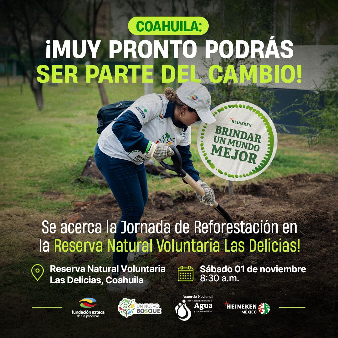 La Secretaría del Medio Ambiente de Coahuila, en conjunto con Fundación Azteca, Universidad Autónoma de Coahuila (UA de C) y Heineken México, llevará a cabo una Jornada de Reforestación el próximo primero de noviembre, a partir de las 8:30 de la mañana, en la Reserva Natural Las Delicias, ubicada en la Sierra de Arteaga, donde se tiene previsto plantar dos mil árboles como parte de las acciones de conservación ambiental.