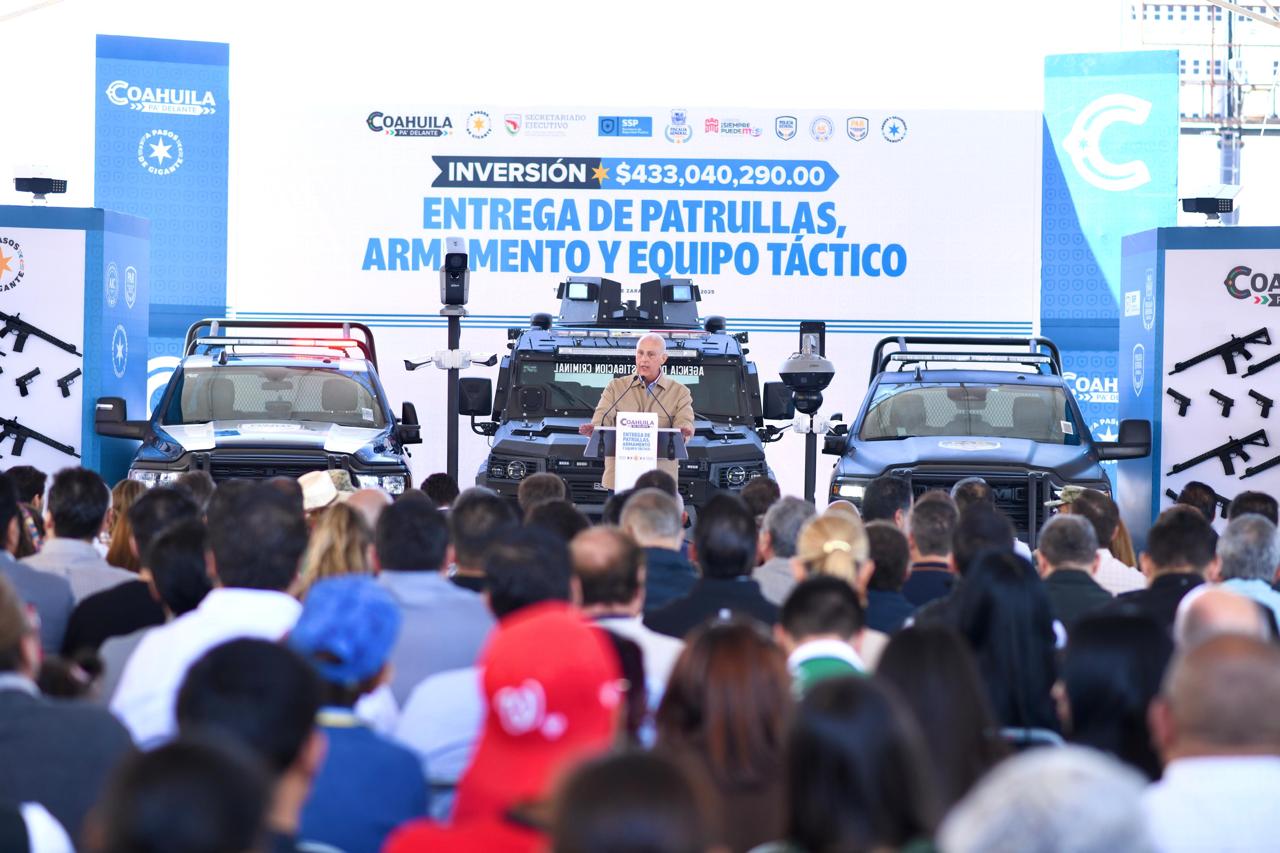 Manolo Jiménez entrega patrullas, armamento y equipo táctico en Torreón para las corporaciones de Coahuila