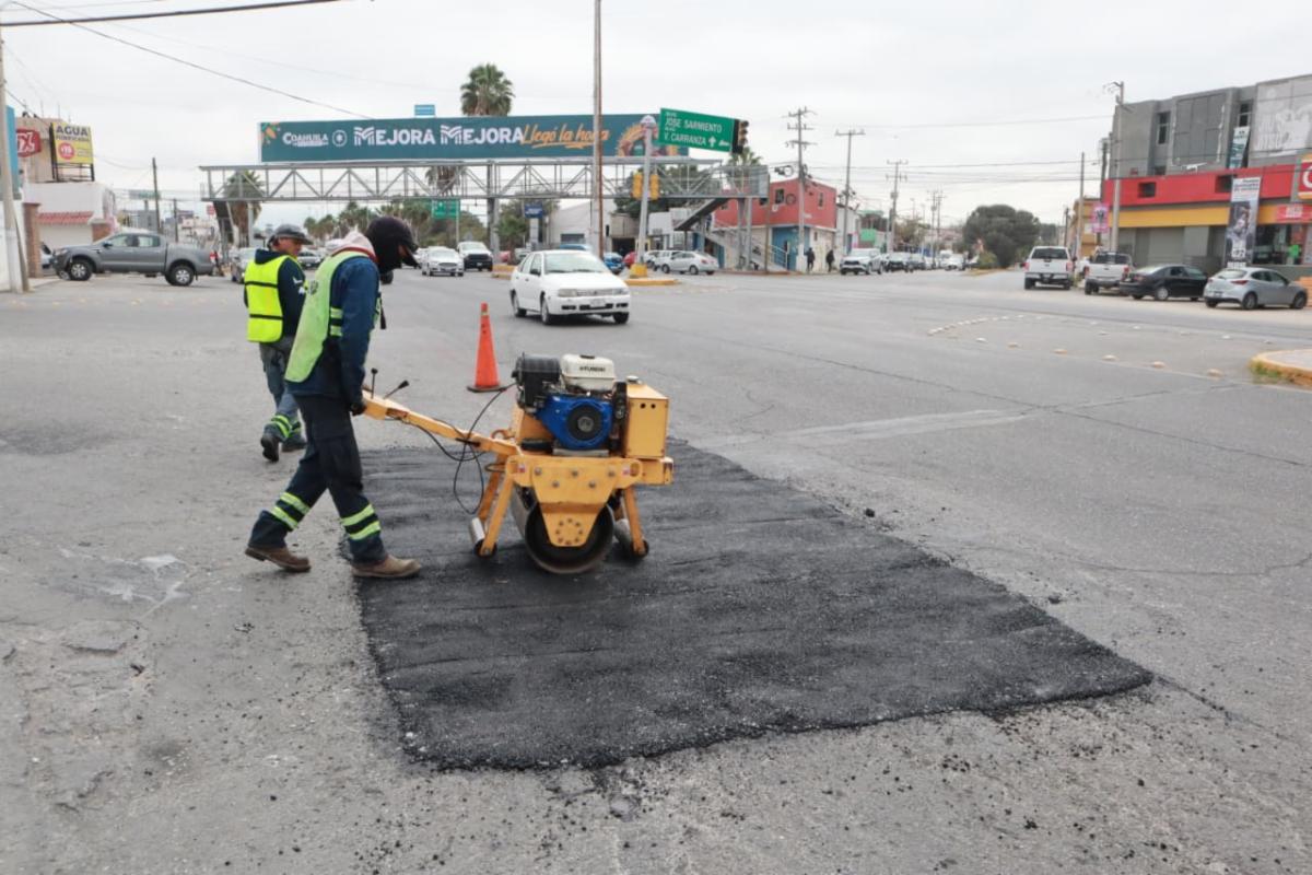 En este punto, brigadas municipales bachearon distintos puntos afectados de esta vialidad, en el tramo que comprende entre los bulevares Vito Alessio Robles y Venustiano Carranza.