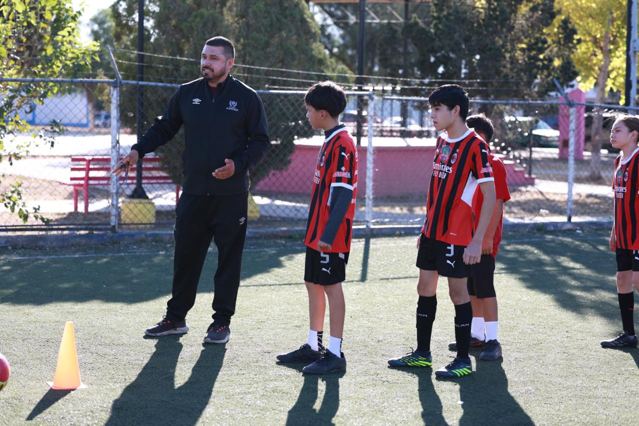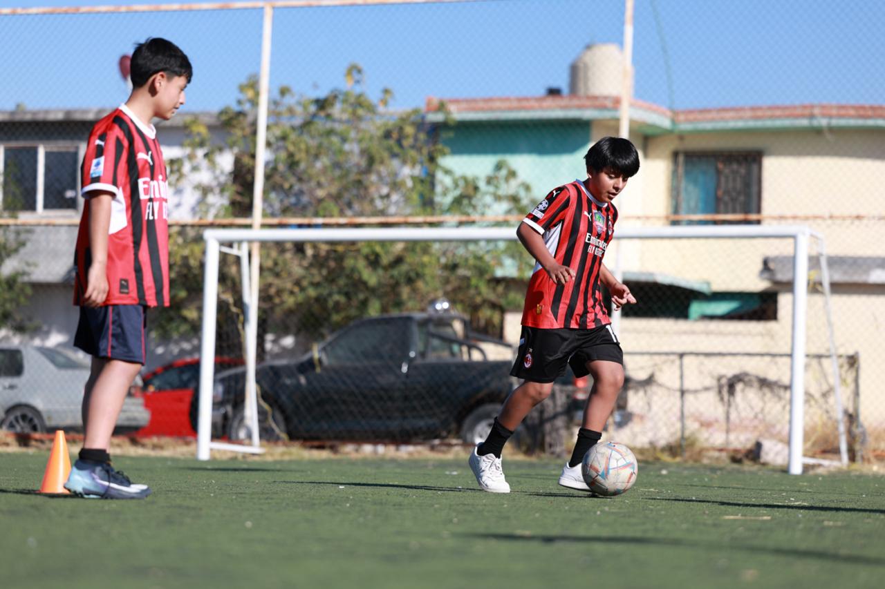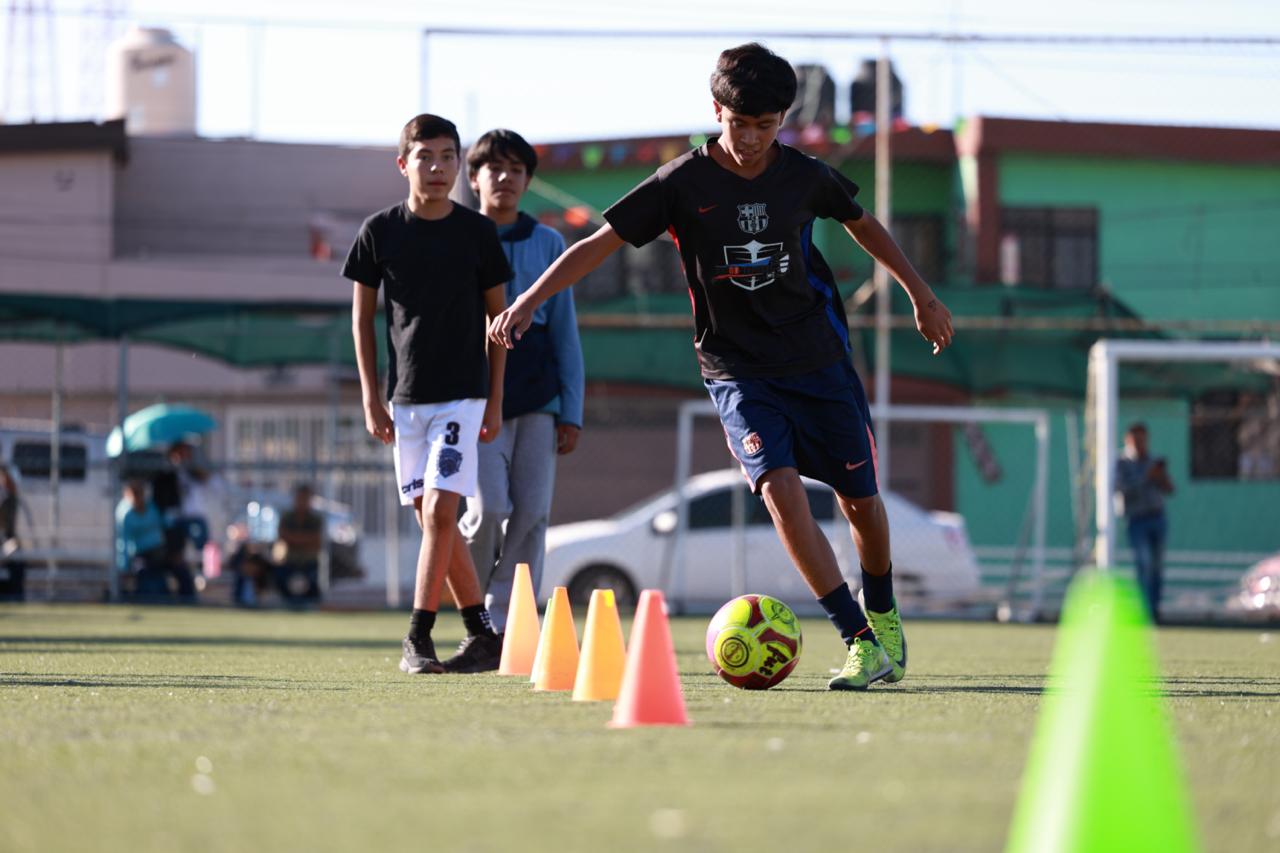 Ejemplo de ello es en la cancha que se ubica en la colonia Ojo de Agua, donde niñas, niños y jóvenes participan en clases de fútbol, bajo la instrucción del promotor deportivo, Ricardo Duéñez.