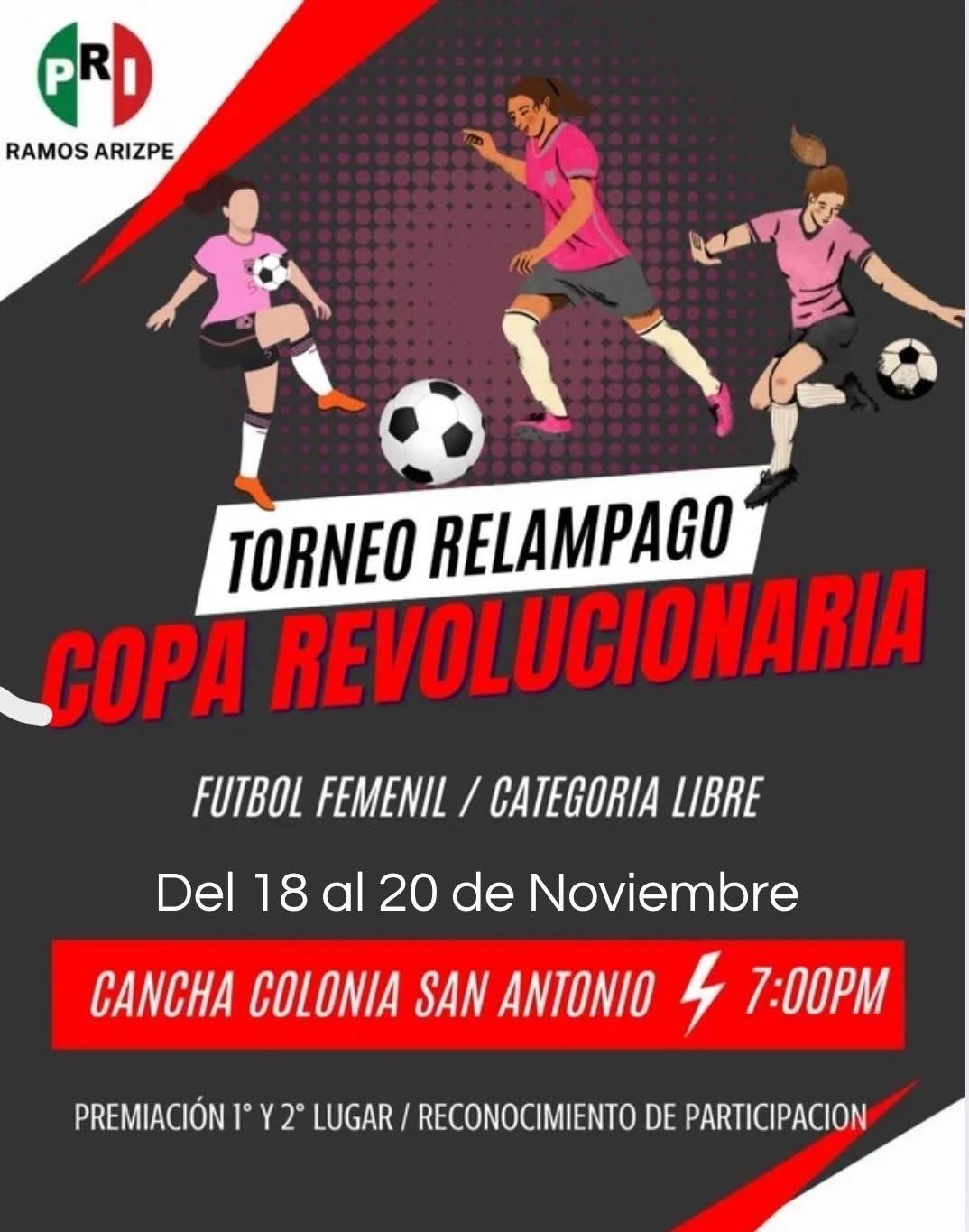 El Comité Directivo Municipal del Partido Revolucionario Institucional (PRI) en Ramos Arizpe dio a conocer la realización del Torneo Relámpago “Copa Revolucionaria” 2025, un encuentro deportivo femenil en categoría libre que se llevará a cabo del 18 al 20 de noviembre en la cancha de futbol rápido de la colonia San Antonio, a partir de las 19:00 horas.