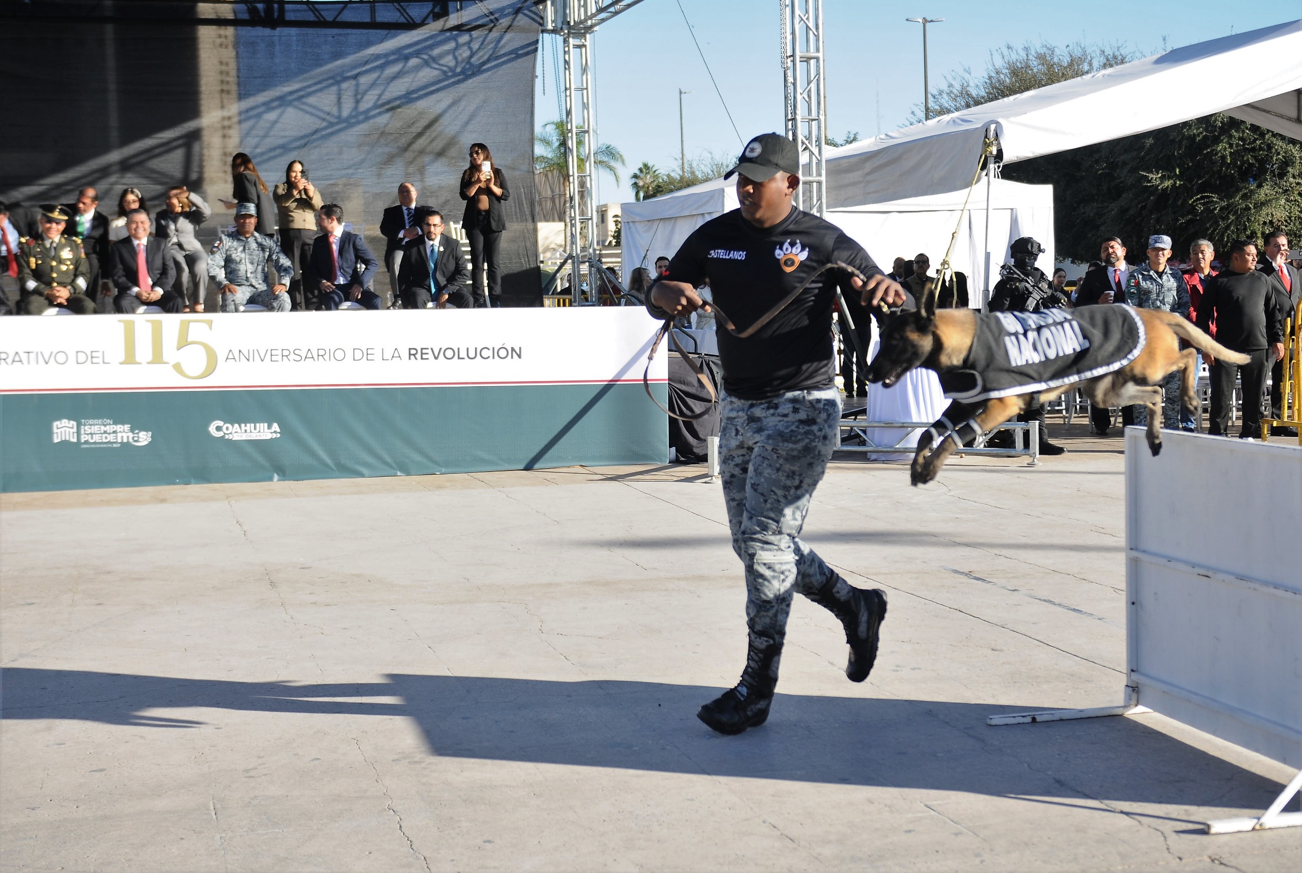La Dirección de Seguridad Pública Municipal recorrió las calles con demostraciones de los binomios caninos, y la Dirección de Protección Civil y Bomberos de Torreón, exhibió el equipo que utilizan en sus labores diarias.