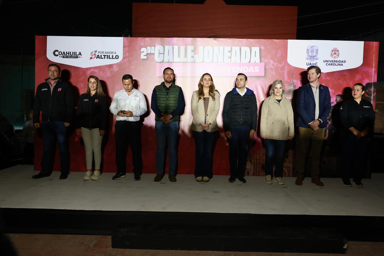 Durante la Callejoneada estuvieron presentes, César Iván Moreno Aguirre, Jefe de Gabinete y Proyectos Estratégicos del Gobierno Municipal; el rector de la Universidad Carolina, Esteban Garza Fishburn, las directoras Leticia Rodarte Rangel y Lydia González Rodríguez, de Cultura y Turismo, respectivamente, además de la subcoordinadora de Difusión Cultural de la Universidad Autónoma de Coahuila, Ana Elena Flores González; Eduardo Morelos Jiménez, regidor presidente de la Comisión de Planeación, Urbanismo, Obras Públicas y Centro Histórico y el Presidente de la Comisión de Desarrollo Económico y Turismo, Ricardo Treviño Salinas. (El Heraldo de Saltillo)