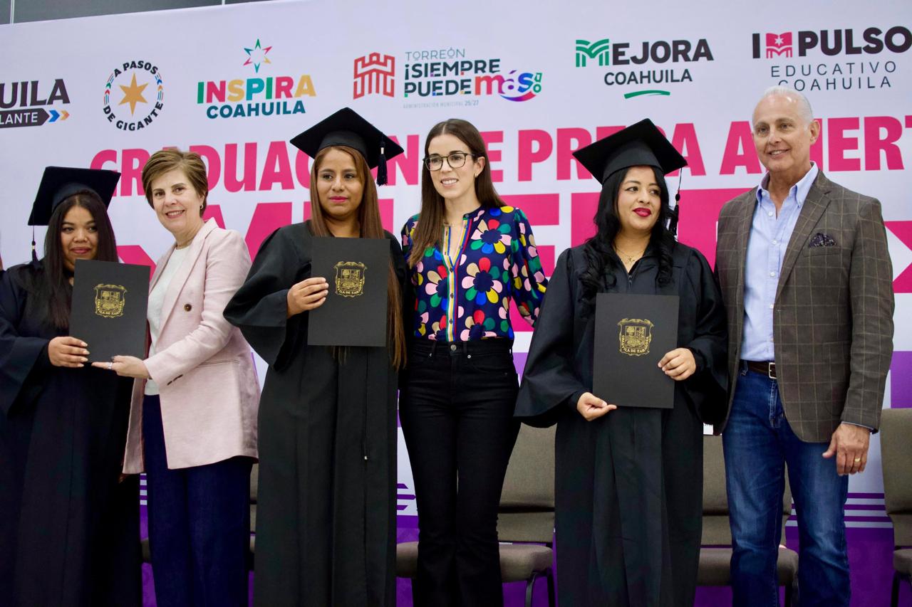 “Gracias por hacer suyo este programa y creer en la educación como la mejor herramienta para transformar vidas, y por invertir la mitad del costo de la preparatoria de cada mujer echada pa´ adelante, por abrir espacios, por brindar apoyo y hacer posible que aquí en Torreón haya historias de superación como las de hoy se celebran”, dijo Paola Rodríguez López.