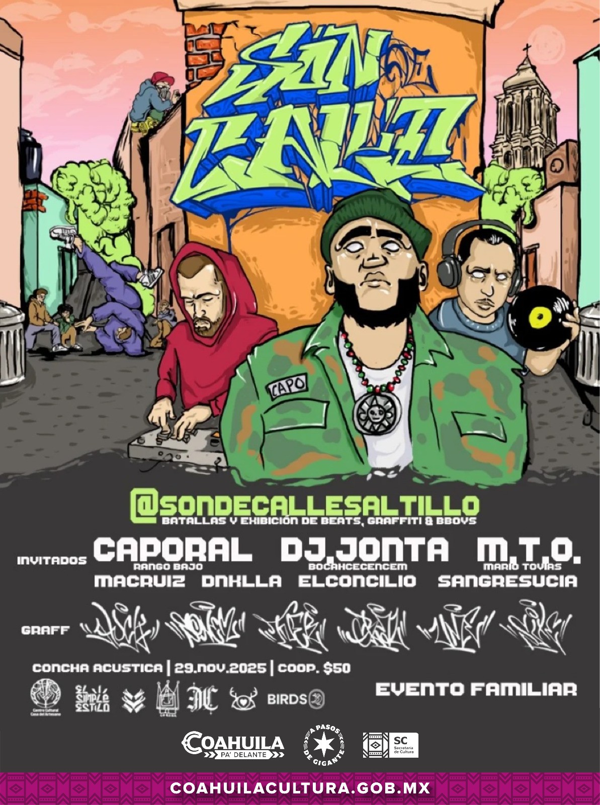 El Gobierno del Estado de Coahuila, a través de la Secretaría de Cultura, invita a la comunidad a participar en “Son de Calle”, una jornada dedicada al hip hop y a la recuperación del espacio público, que se llevará a cabo este 29 de noviembre en la Concha Acústica de la Casa del Artesano.