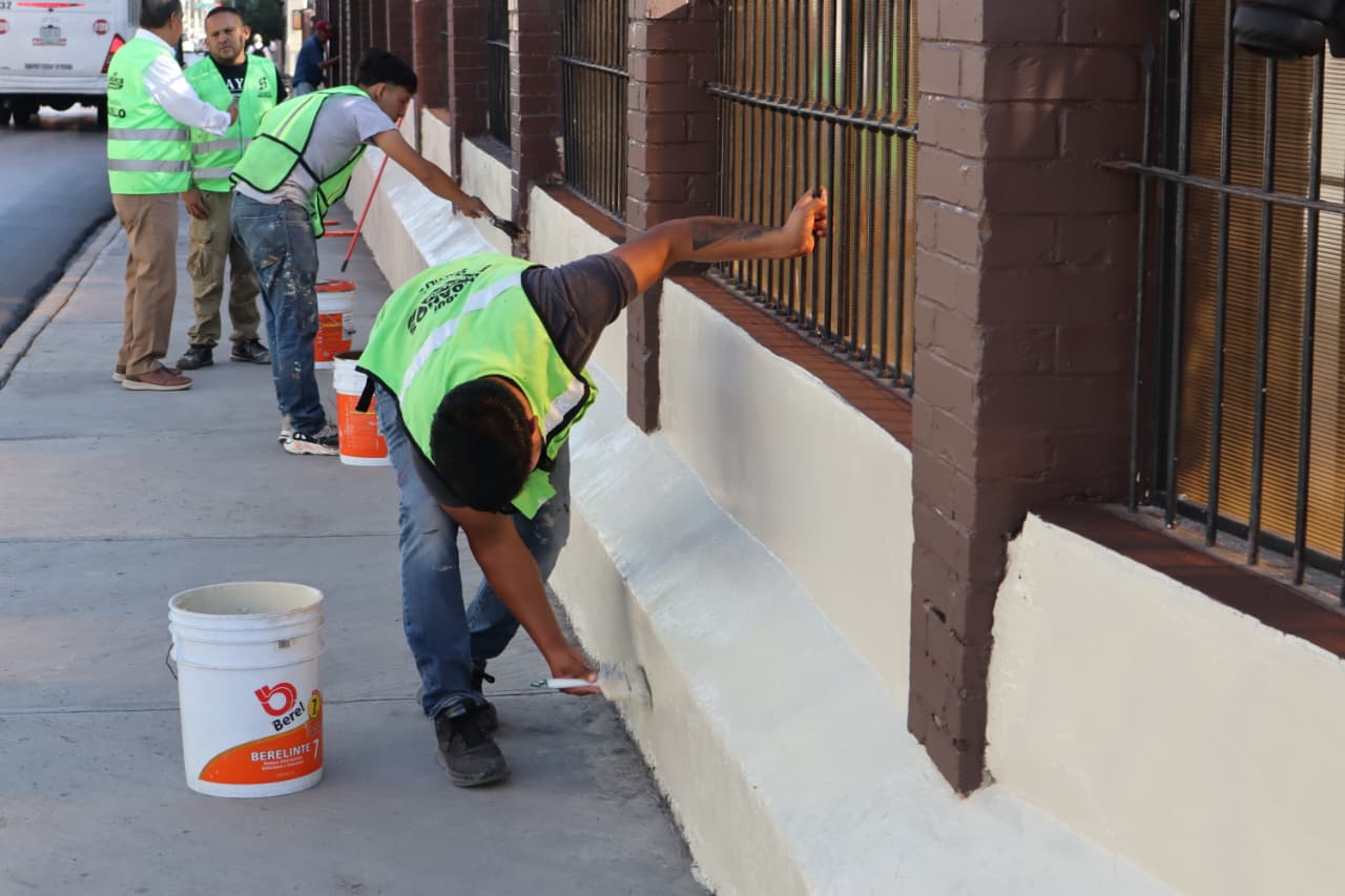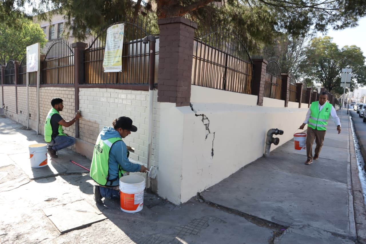 Por instrucción del alcalde Javier Díaz González, personal municipal lleva a cabo la intervención de los muros de la fachada perimetral de la histórica Escuela Primaria “Miguel López”, con el propósito de reforzar el compromiso con la educación, la preservación del patrimonio y el mejoramiento del entorno urbano en Saltillo.