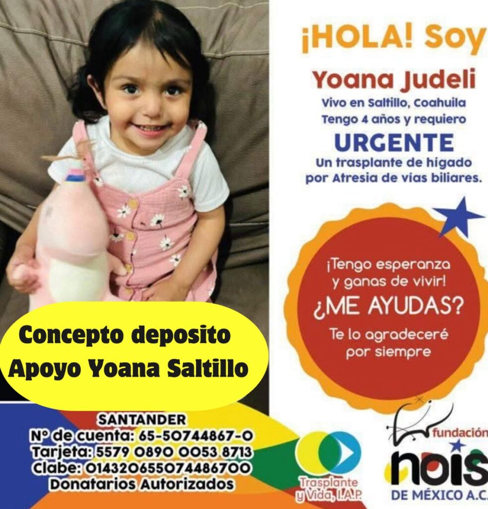 Las personas interesadas en apoyar pueden hacerlo a través de la fundación “Nois de México”, mediante la cuenta Santander 65 50744867 0, con clabe interbancaria 014320655074486700, o bien en la tarjeta del mismo banco 5579 0890 0053 8713, bajo el concepto “Apoyo Yoana Saltillo”.