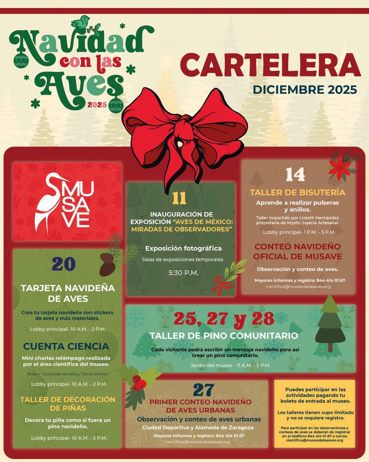 El Museo de las Aves de México (MUSAVE) llevará a cabo a partir del jueves 11 de diciembre su tradicional festival denominado “Navidad con las Aves”, en el que se llevarán a cabo diversas actividades en las que las y los saltillenses podrán participar con el pago de su boleto de entrada.